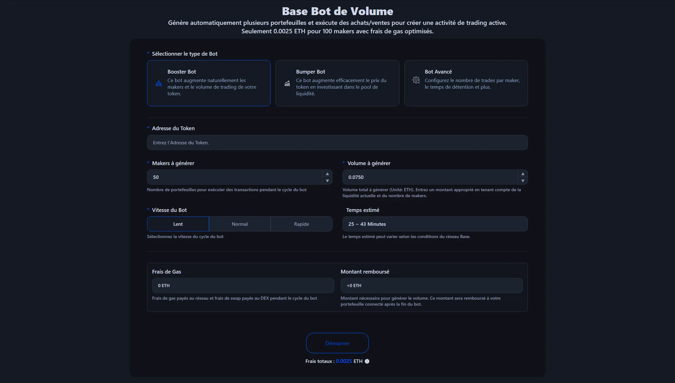 - Configurez les Paramètres : Définissez le nombre de makers à générer, le volume de trading ou le montant d'ETH à injecter dans le pool de liquidité, et la vitesse du bot.