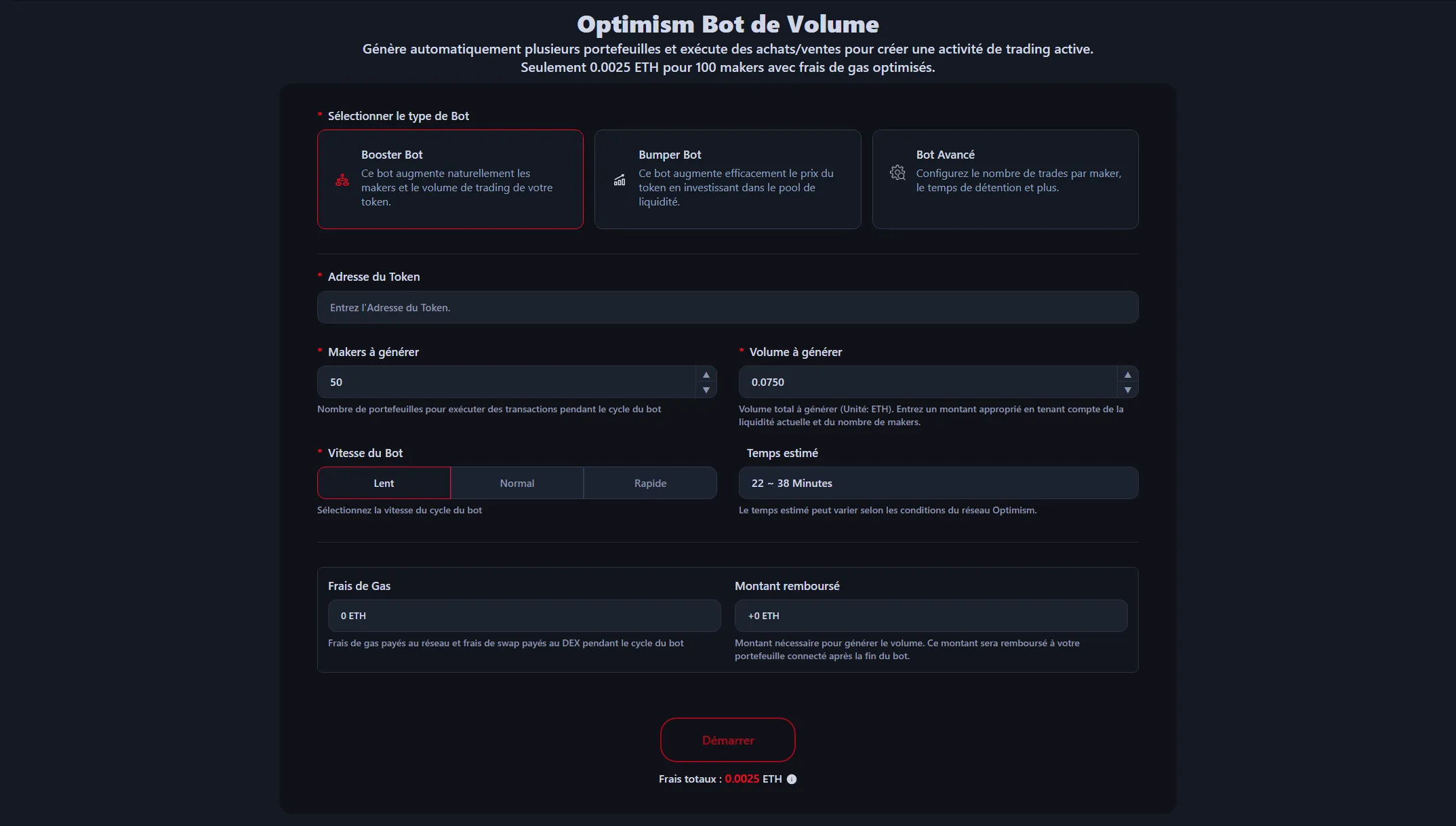 Le Bot de Volume Optimism est un outil accessible à tous. Vous devez connecter un portefeuille compatible Optimism Chain avec suffisamment d'ETH pour les frais de gas et la génération de volume. Une fois ces conditions remplies, suivez ces étapes :