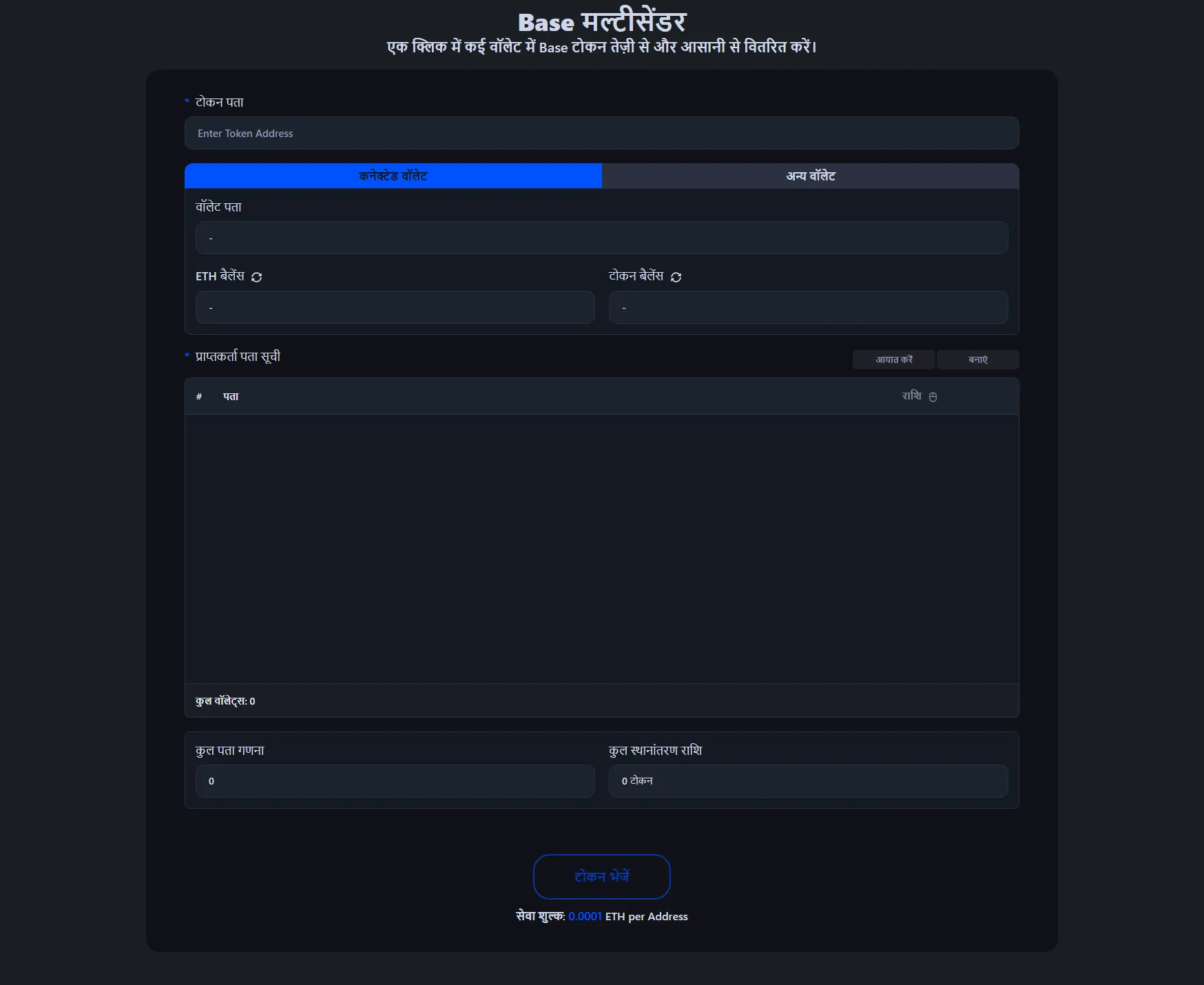 Base पर कई वॉलेट में टोकन भेजने के लिए, Base मल्टीसेंडर टूल पर जाएं और अपना वॉलेट कनेक्ट करें।