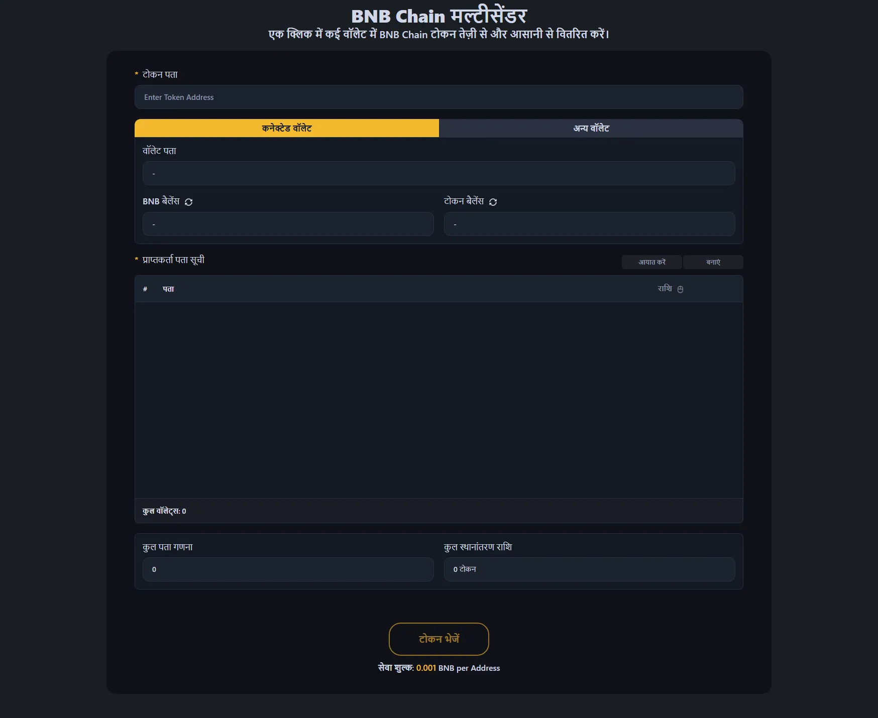 सर्विस फीस प्रत्येक प्राप्तकर्ता एड्रेस पर 0.0001 BNB है। उदाहरण के लिए, 100 वॉलेट पर टोकन भेजने पर सर्विस फीस 0.01 BNB होगी, साथ ही स्टैंडर्ड BNB Chain गैस फीस।