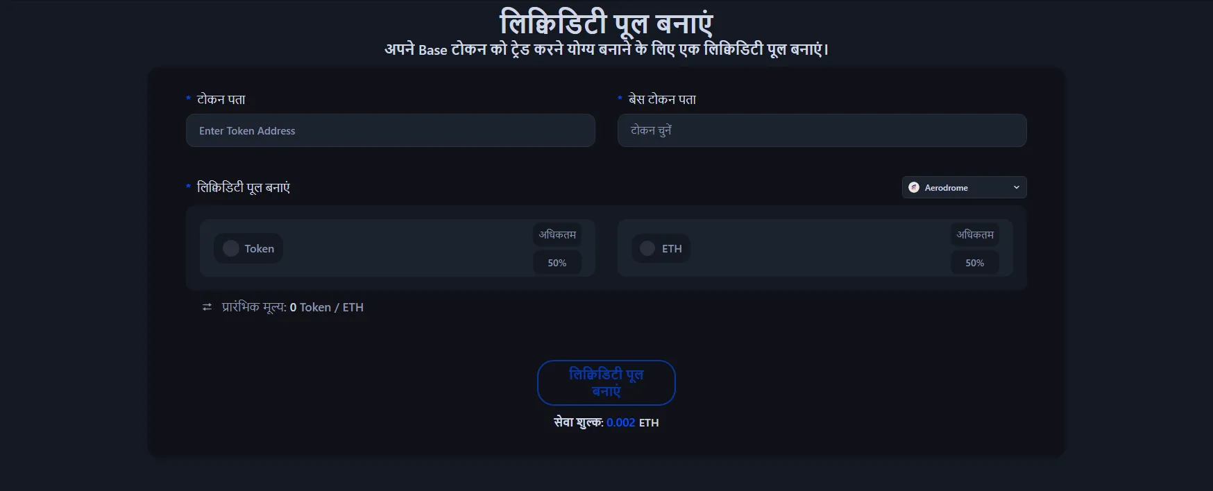 - DEX चुनें (Aerodrome, Uniswap, PancakeSwap या QuickSwap) और V2 या V3 पूल टाइप चुनें