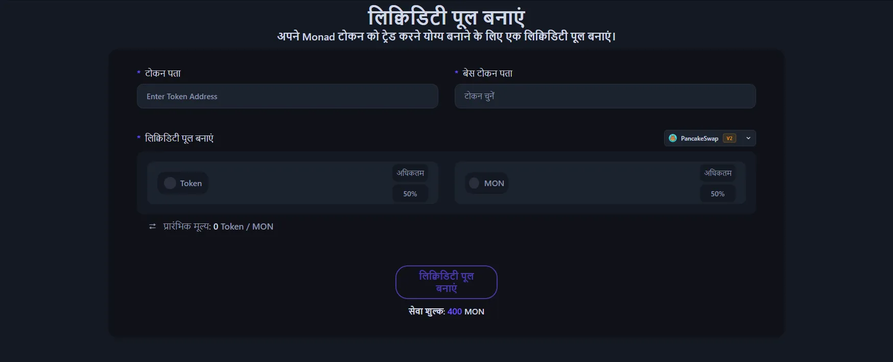 - पेयरिंग टोकन चुनें (MON, USDT, USDC आदि) — यह आपके टोकन की वैल्यू निर्धारित करेगा।