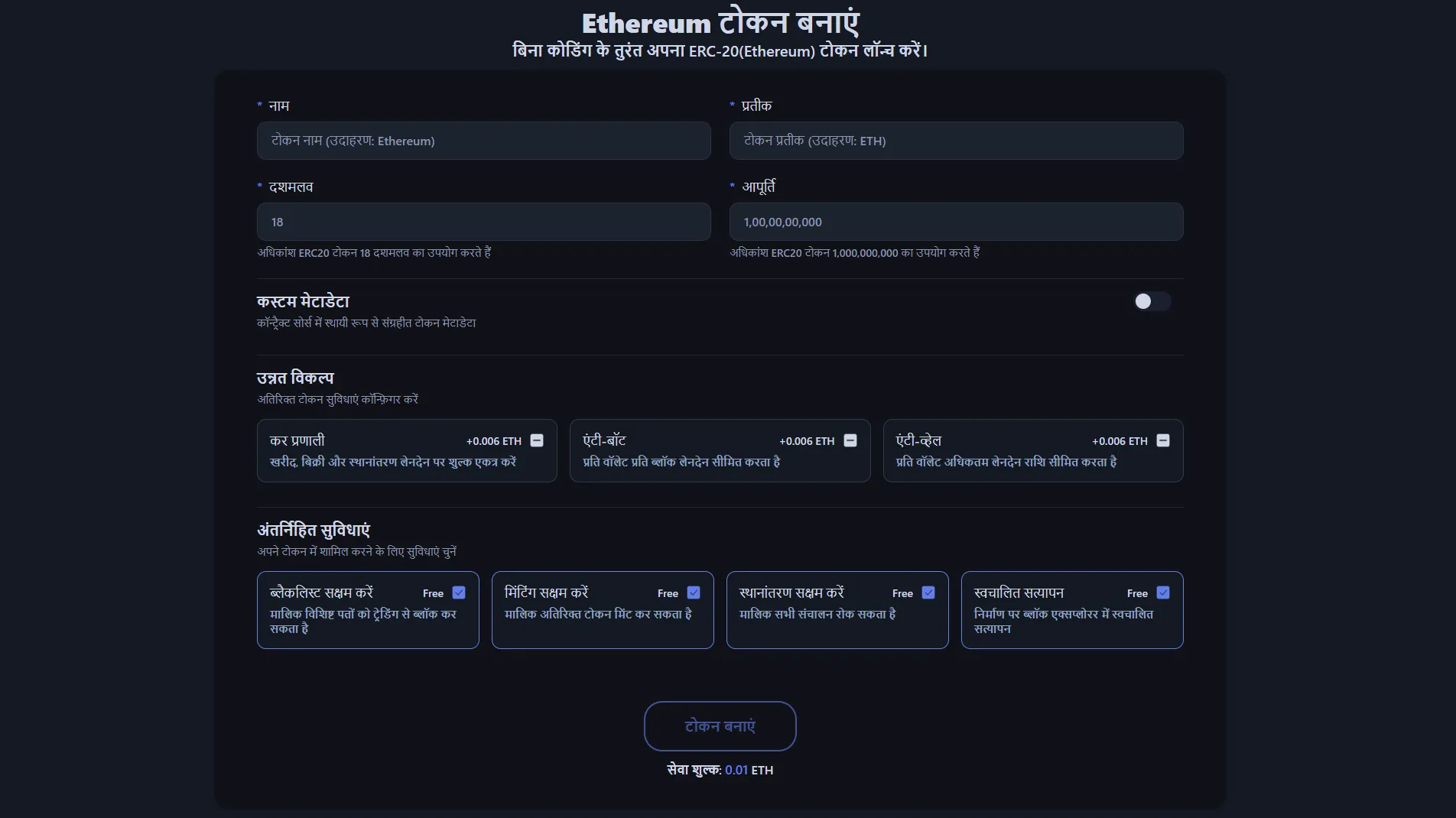 Ethereum Token Creator का उपयोग करने से जटिल कोडिंग प्रक्रिया समाप्त हो जाती है। स्मार्ट कॉन्ट्रैक्ट केवल कुछ क्लिक के साथ ऑटोमैटिकली जनरेट हो जाते हैं, और प्रोफेशनल-ग्रेड टोकन डिप्लॉयमेंट 0.01 ETH में पूरा हो जाता है।