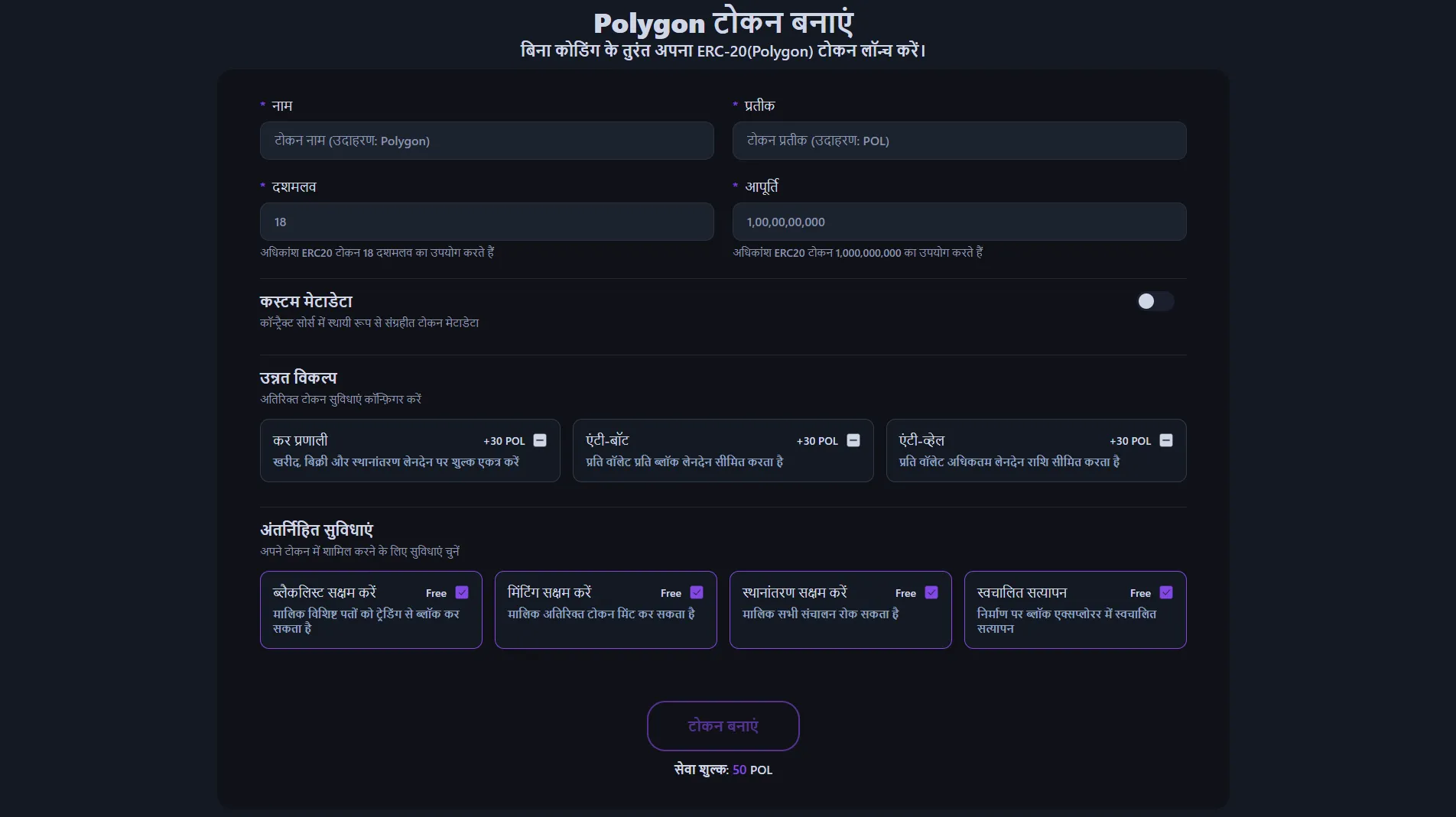 यह dApp Polygon (ERC-20) मानक का पूर्ण अनुपालन करता है, जो Ethereum की स्केलेबिलिटी समस्याओं को हल करने के लिए डिज़ाइन किया गया है, जो कम शुल्क और तेज प्रोसेसिंग गति के लिए जाना जाता है। साधारण टोकन निर्माण से परे, आप अपने प्रोजेक्ट की विशेषताओं से मेल खाने के लिए विस्तृत विकल्पों को स्वतंत्र रूप से कॉन्फ़िगर कर सकते हैं।