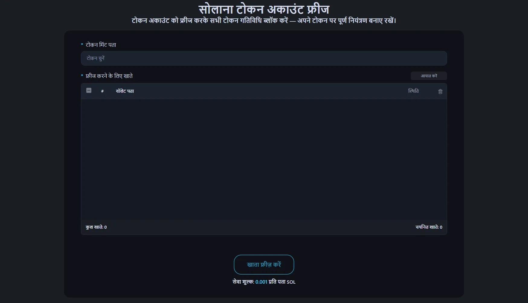 - फ़्रीज़ टूल एक्सेस करें: Solana टोकन खाता फ़्रीज़ पर जाएँ। अपना वॉलेट कनेक्ट करें — यह वह वॉलेट होना चाहिए जो टोकन की फ़्रीज़ अथॉरिटी रखता है।