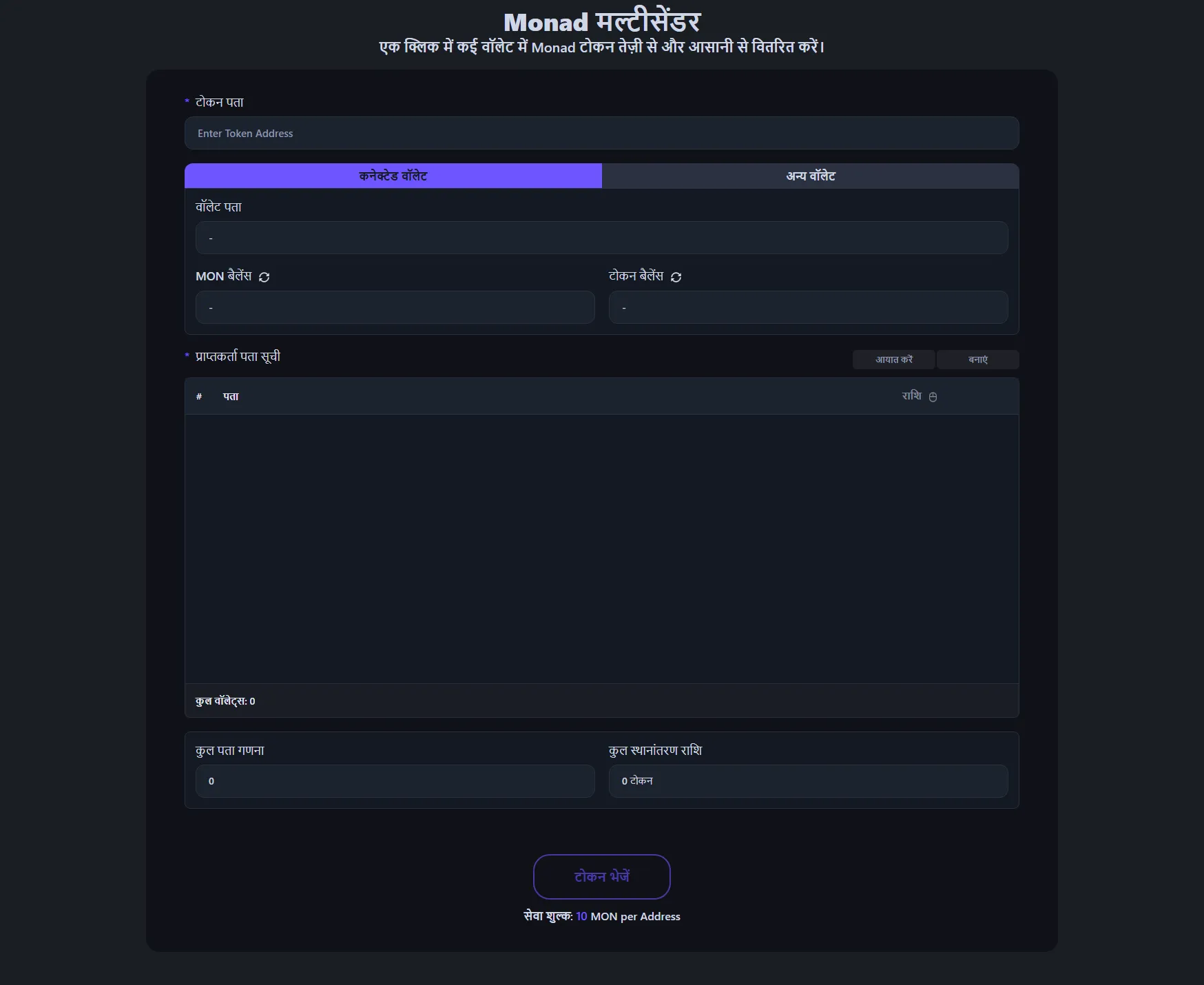 सर्विस फीस प्रत्येक प्राप्तकर्ता एड्रेस पर 10 MON है। उदाहरण के लिए, 100 वॉलेट पर टोकन भेजने पर सर्विस फीस 1,000 MON होगी, साथ ही स्टैंडर्ड Monad गैस फीस।