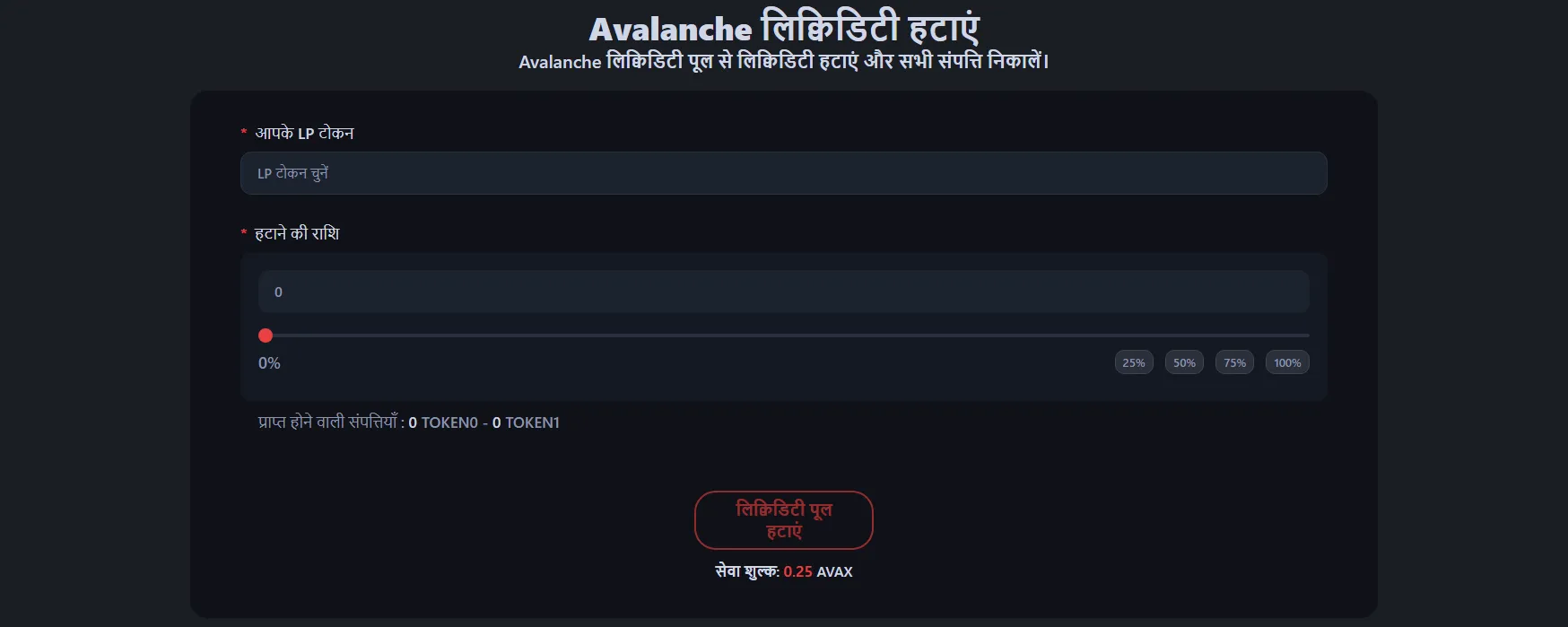अपने Avalanche टोकन पूल से लिक्विडिटी हटाने के लिए, Avalanche लिक्विडिटी रिमूवल टूल पर जाएं और अपने LP टोकन या NFT पोजीशन वाला वॉलेट कनेक्ट करें।