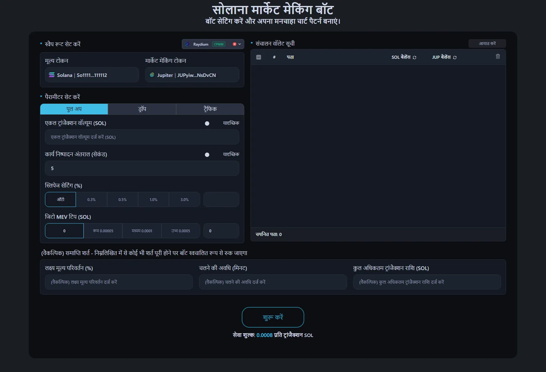 विस्तृत पैरामीटर विवरण और तकनीकी सेटअप के लिए Solana मार्केट मेकिंग बॉट डॉक्यूमेंटेशन देखें।