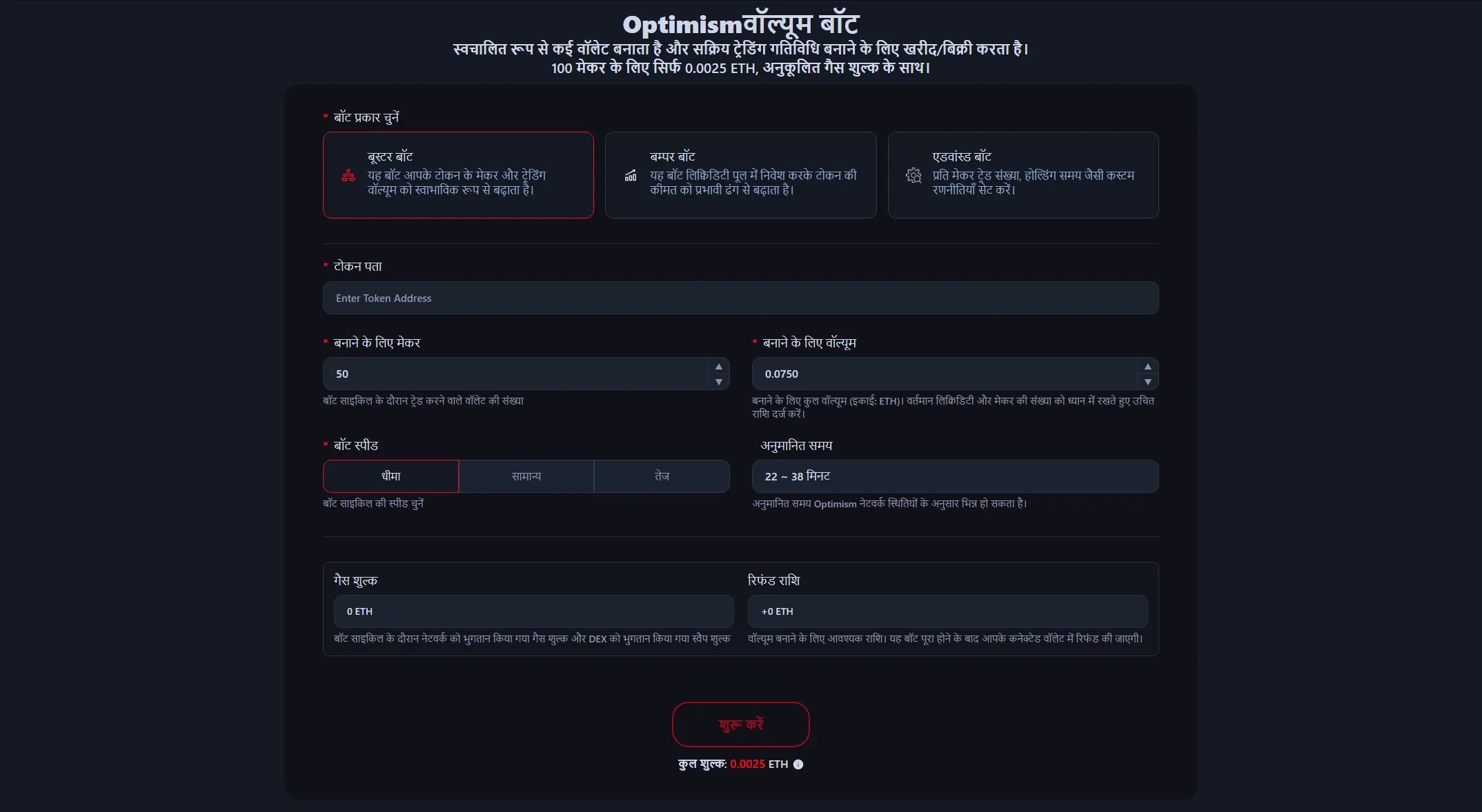 100 मेकर्स के लिए 0.0025 ETH पर उपलब्ध है, ट्रेडिंग वॉल्यूम के आधार पर कोई अतिरिक्त लागत नहीं। गैस फीस और DEX स्वैप फीस बॉट शुरू करने से पहले कैलकुलेट और डिस्प्ले होती हैं, ऑप्टिमाइज्ड अमाउंट पर एक्जीक्यूट होती हैं। बॉट पूरा होने के बाद रिफंड होने वाली ETH भी आप देख सकते हैं।