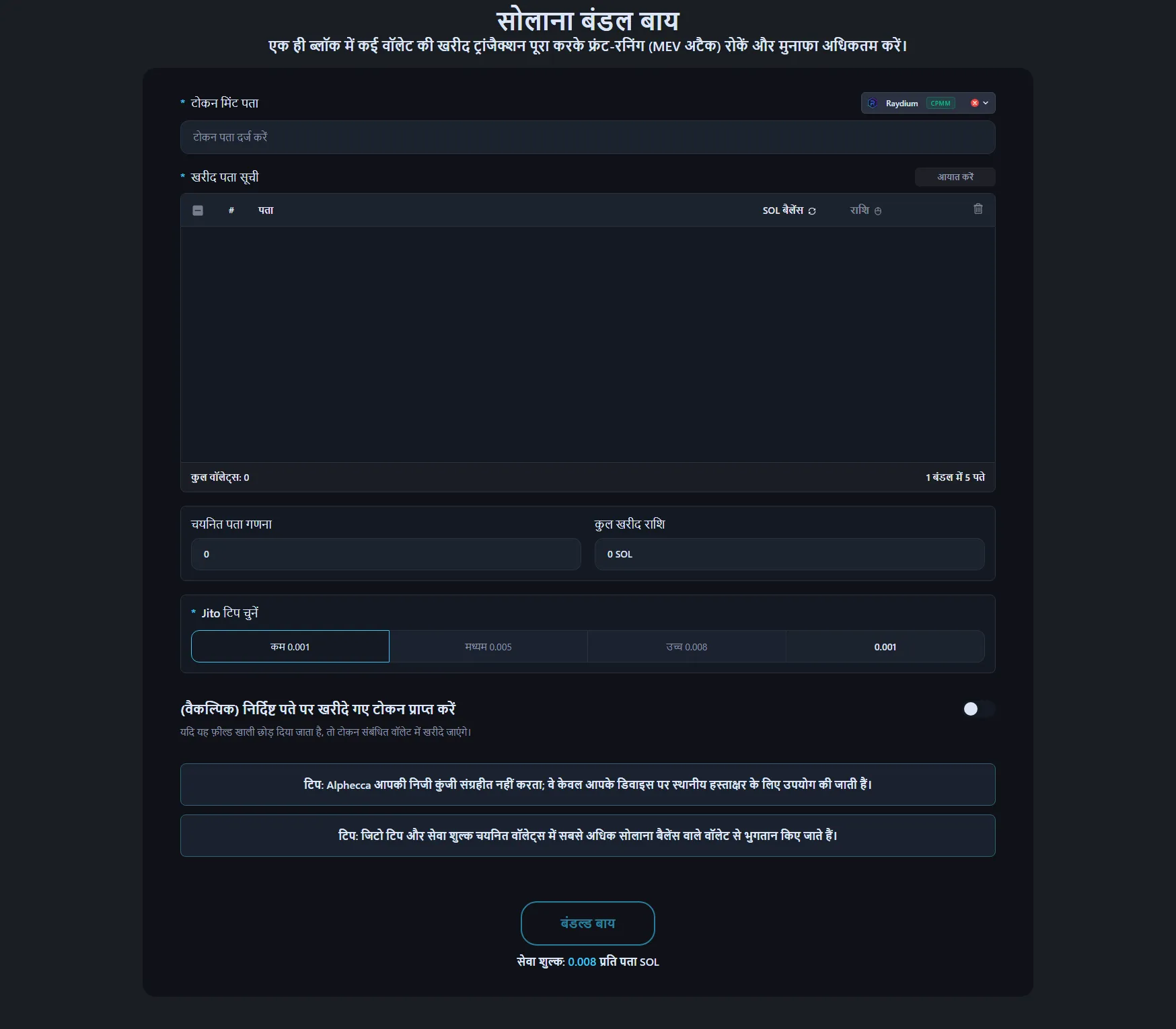 - प्लेटफॉर्म सभी खरीद लेनदेन को एक Jito बंडल में पैकेज करता है।