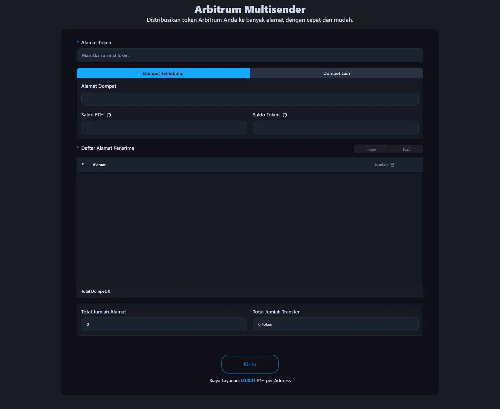 Biaya layanan adalah 0.0001 ETH per alamat penerima. Misalnya, jika mengirim token ke 100 wallet, biaya layanan adalah 0.01 ETH, ditambah biaya gas standar Arbitrum.