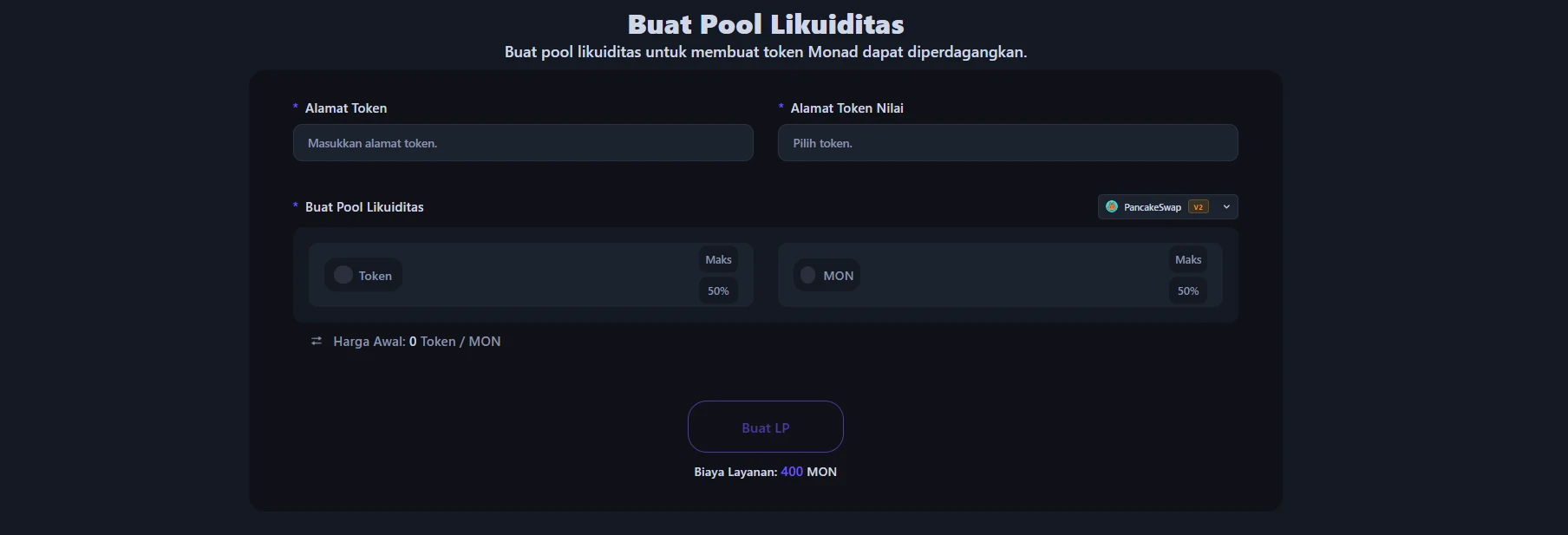 Panduan detail tentang pembuatan liquidity pool token Monad tersedia di Tutorial Pembuatan Liquidity Pool Chain EVM.