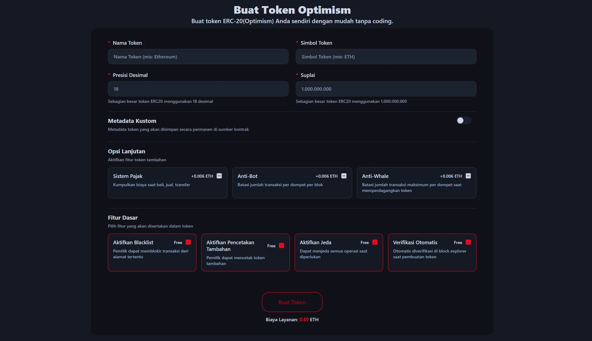 Menggunakan dApp Optimism Token Creator menghilangkan proses coding yang rumit. Smart contract secara otomatis dihasilkan hanya dengan beberapa klik, dan deployment token tingkat profesional selesai dengan 0.01 ETH.