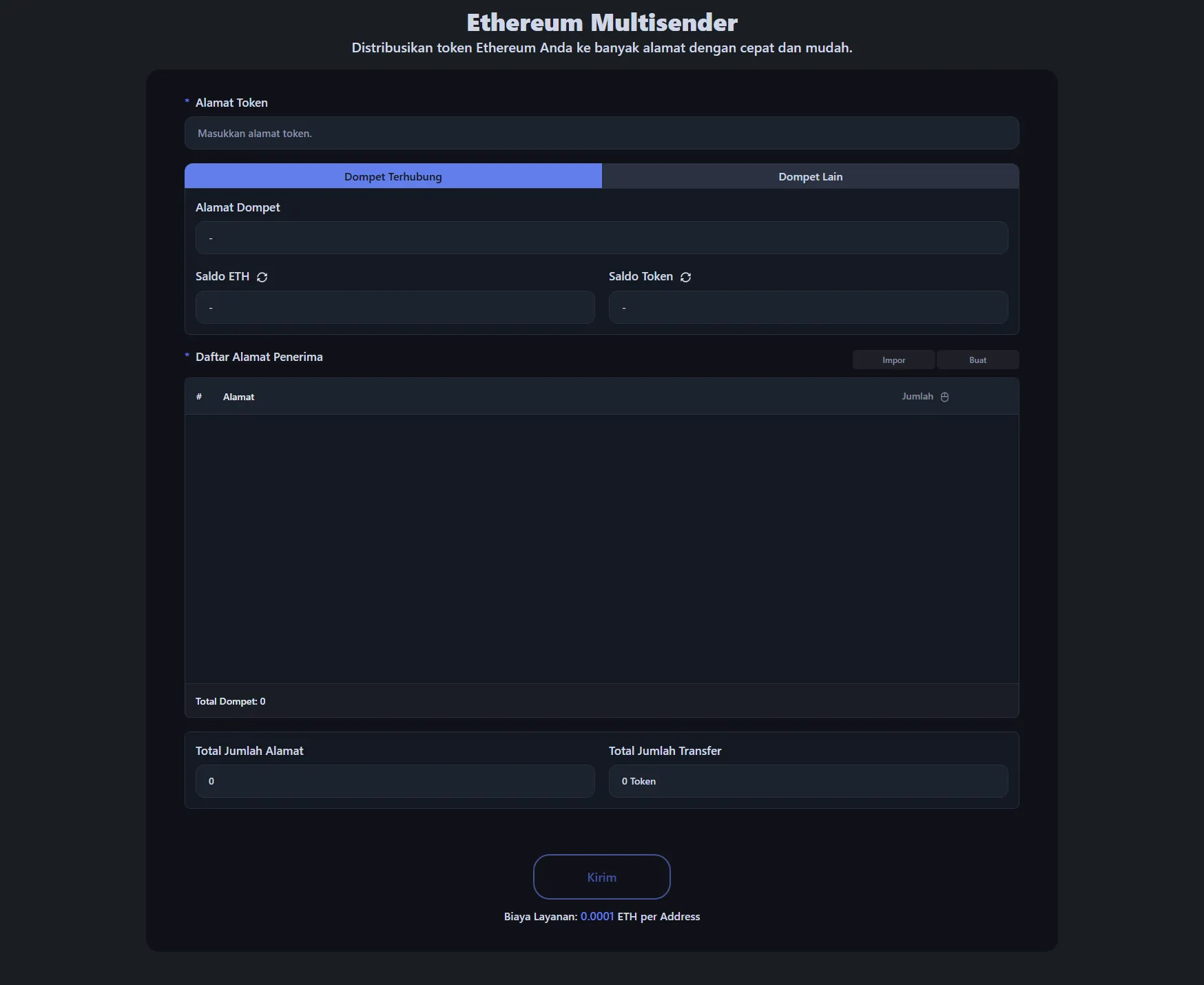 Biaya layanan adalah 0.0001 ETH per alamat penerima. Misalnya, jika mengirim token ke 100 wallet, biaya layanan adalah 0.01 ETH, ditambah biaya gas standar Ethereum.