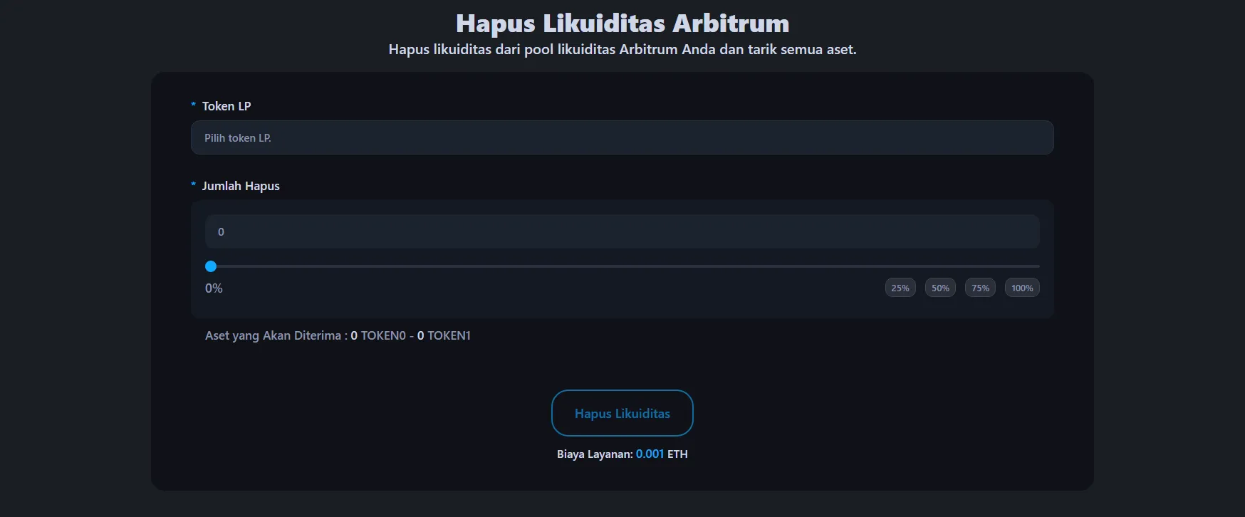 Untuk menghapus likuiditas dari pool token Arbitrum Anda, buka alat penghapusan likuiditas Arbitrum dan hubungkan wallet yang menyimpan token LP atau posisi NFT Anda.