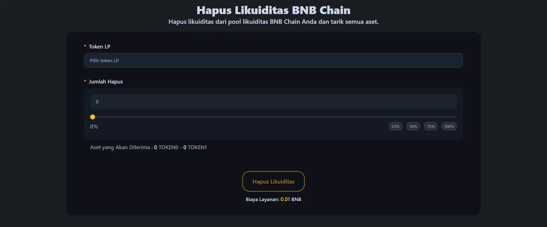 Untuk menghapus likuiditas dari pool token BNB Chain Anda, buka alat penghapusan likuiditas BNB Chain dan hubungkan wallet yang menyimpan token LP atau posisi NFT Anda.