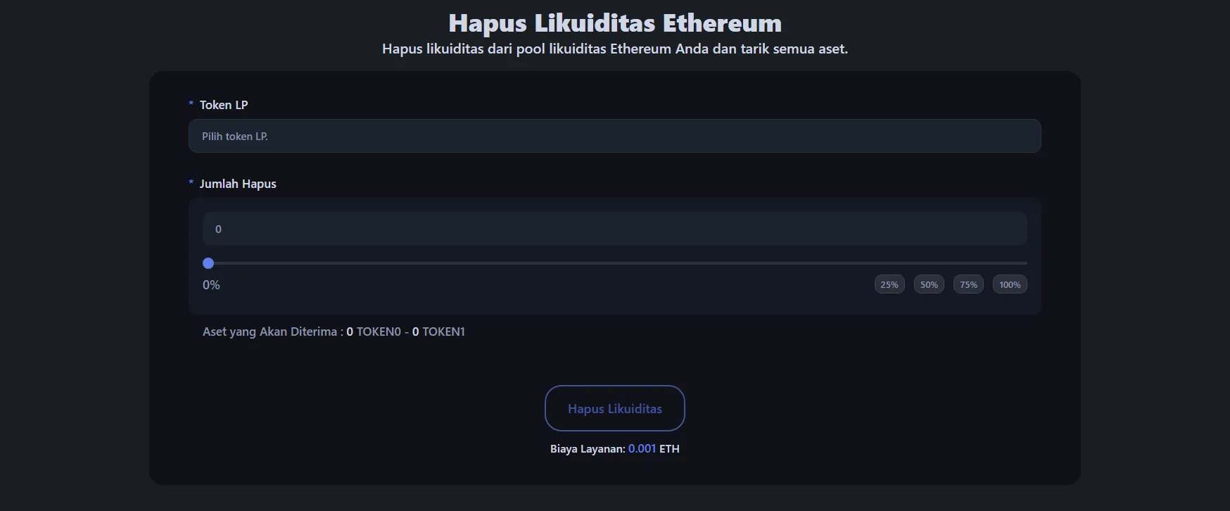 Untuk menghapus likuiditas dari pool token Ethereum Anda, buka alat penghapusan likuiditas Ethereum dan hubungkan wallet yang menyimpan token LP atau posisi NFT Anda.
