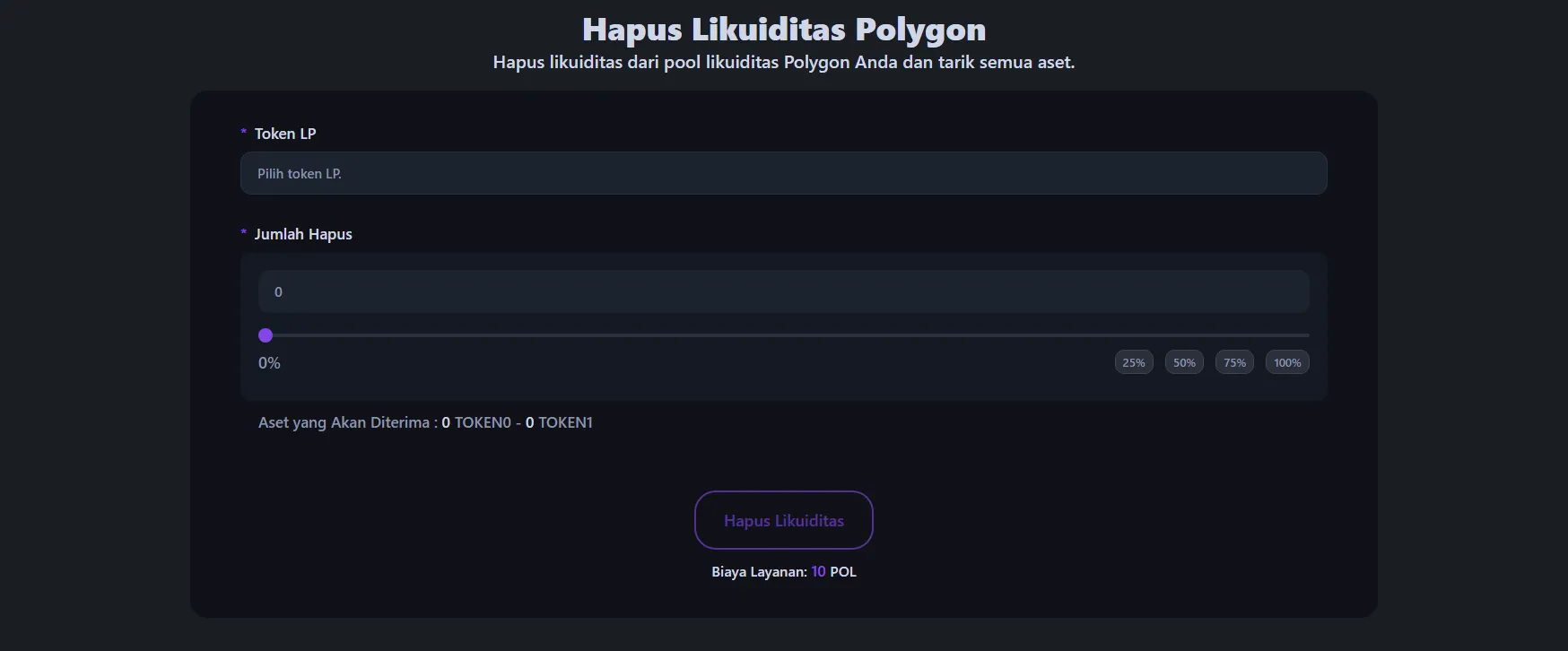Untuk menghapus likuiditas dari pool token Polygon Anda, buka alat penghapusan likuiditas Polygon dan hubungkan wallet yang menyimpan token LP atau posisi NFT Anda.