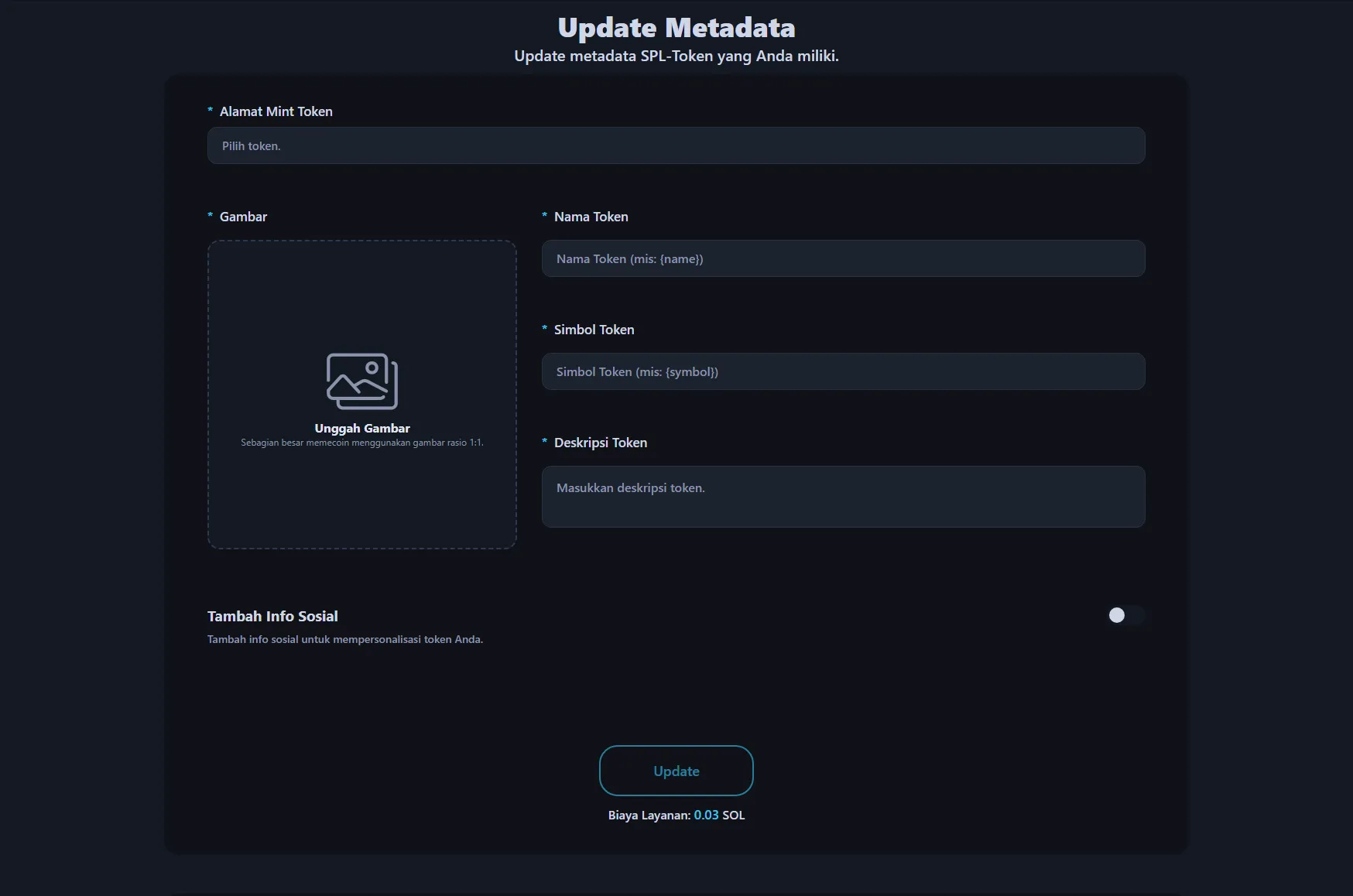 Untuk panduan detail, lihat Tutorial Pembaruan Metadata Token Solana kami.