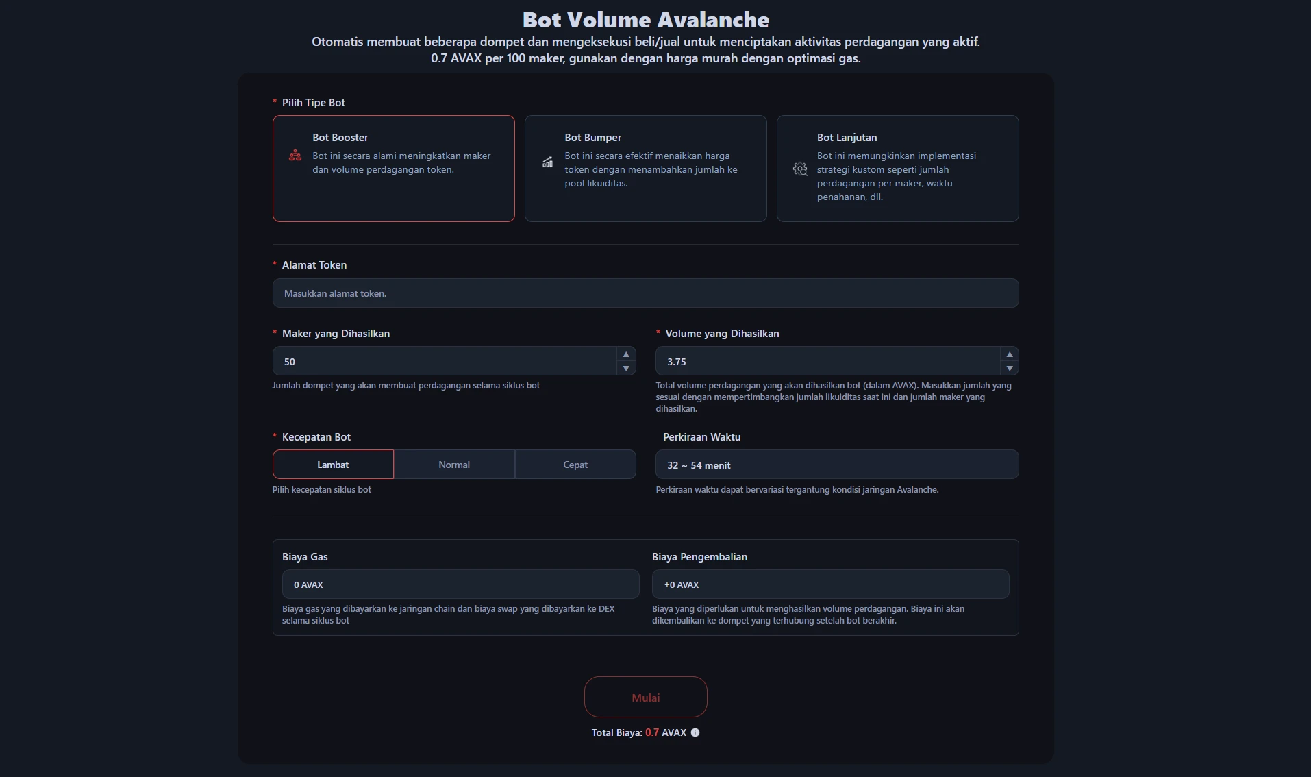 Tutorial detail untuk Volume Bot Avalanche dapat dilihat di halaman panduan Volume Bot Avalanche.