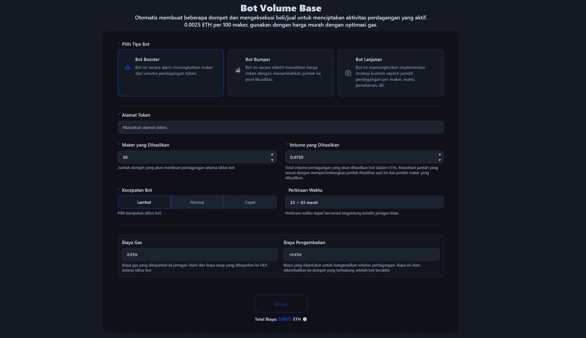 Tersedia dengan harga 0.0025 ETH per 100 maker, tanpa biaya tambahan berdasarkan volume. Biaya gas dan biaya swap DEX dihitung dan ditampilkan sebelum bot dimulai, dieksekusi dengan jumlah yang dioptimalkan. Anda juga bisa melihat ETH yang akan Anda terima kembali setelah bot selesai.
