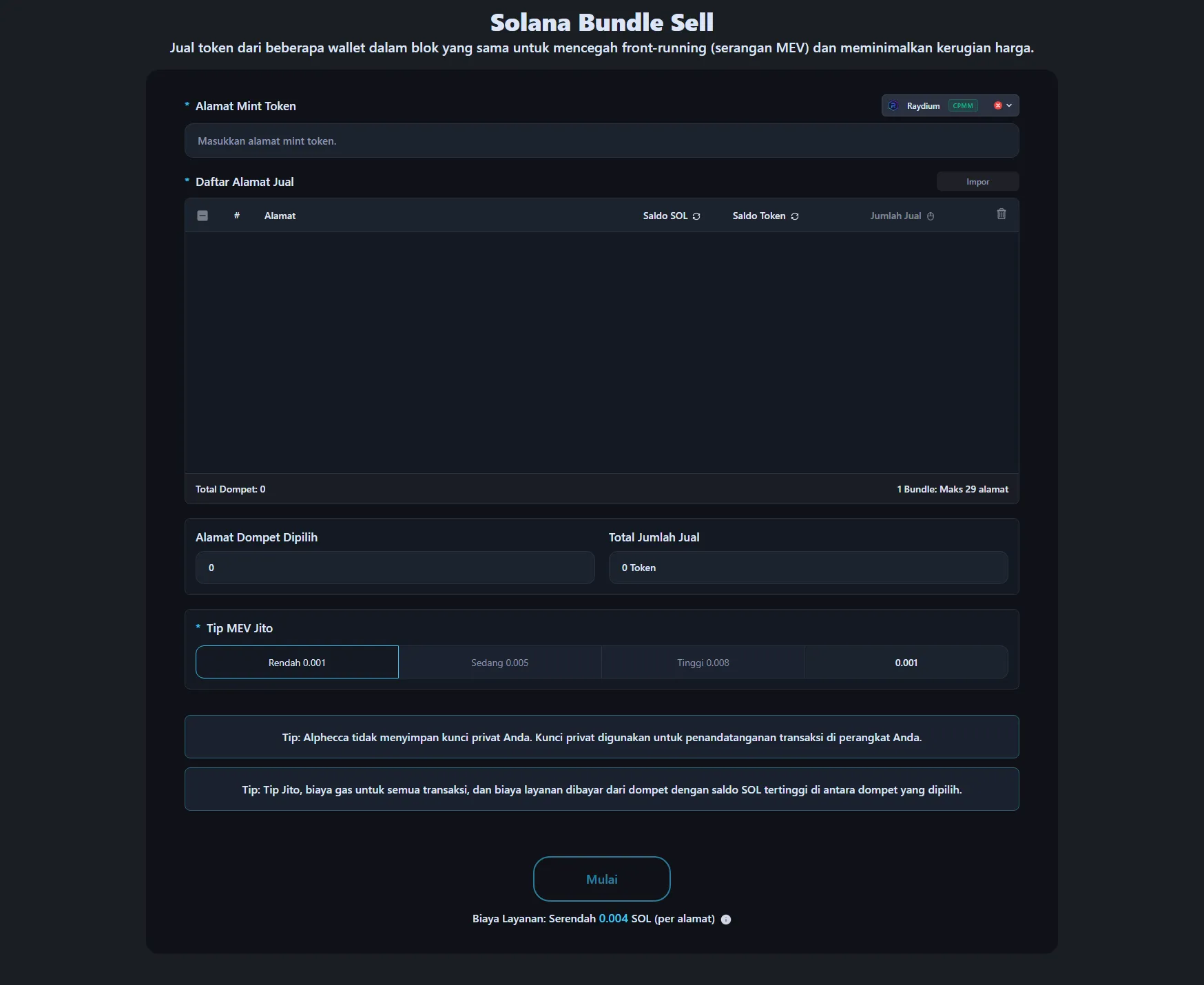 Bundle Sell mendukung DEX utama Solana termasuk Raydium, Pump.Fun, PumpSwap, dan lainnya. Hingga 29 wallet dapat disertakan dalam satu transaksi bundle.