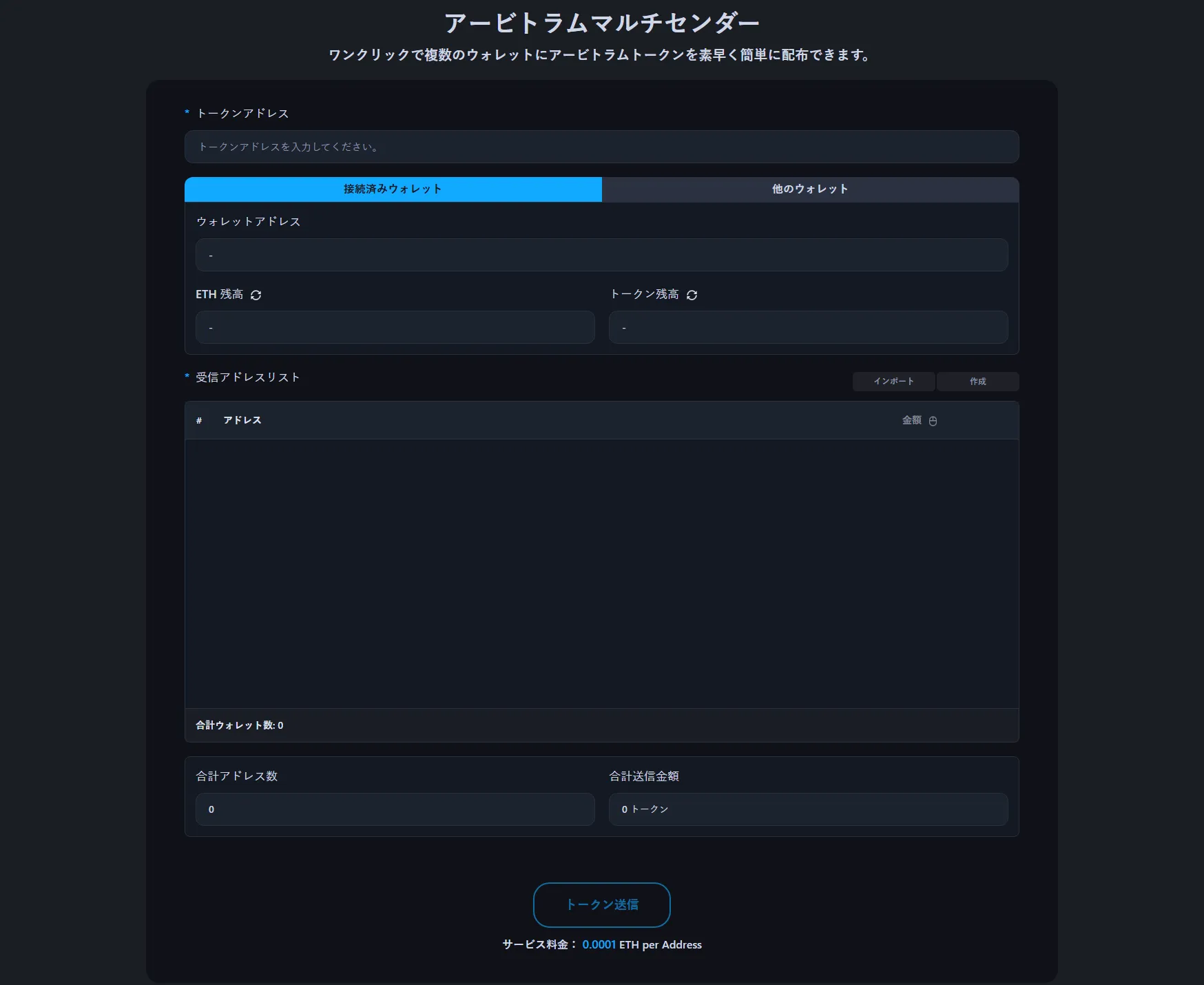 サービス料は受取アドレスあたり0.0001 ETHです。例えば、100ウォレットにトークンを送信する場合、サービス料は0.01 ETHで、標準的なArbitrumガス代が加算されます。