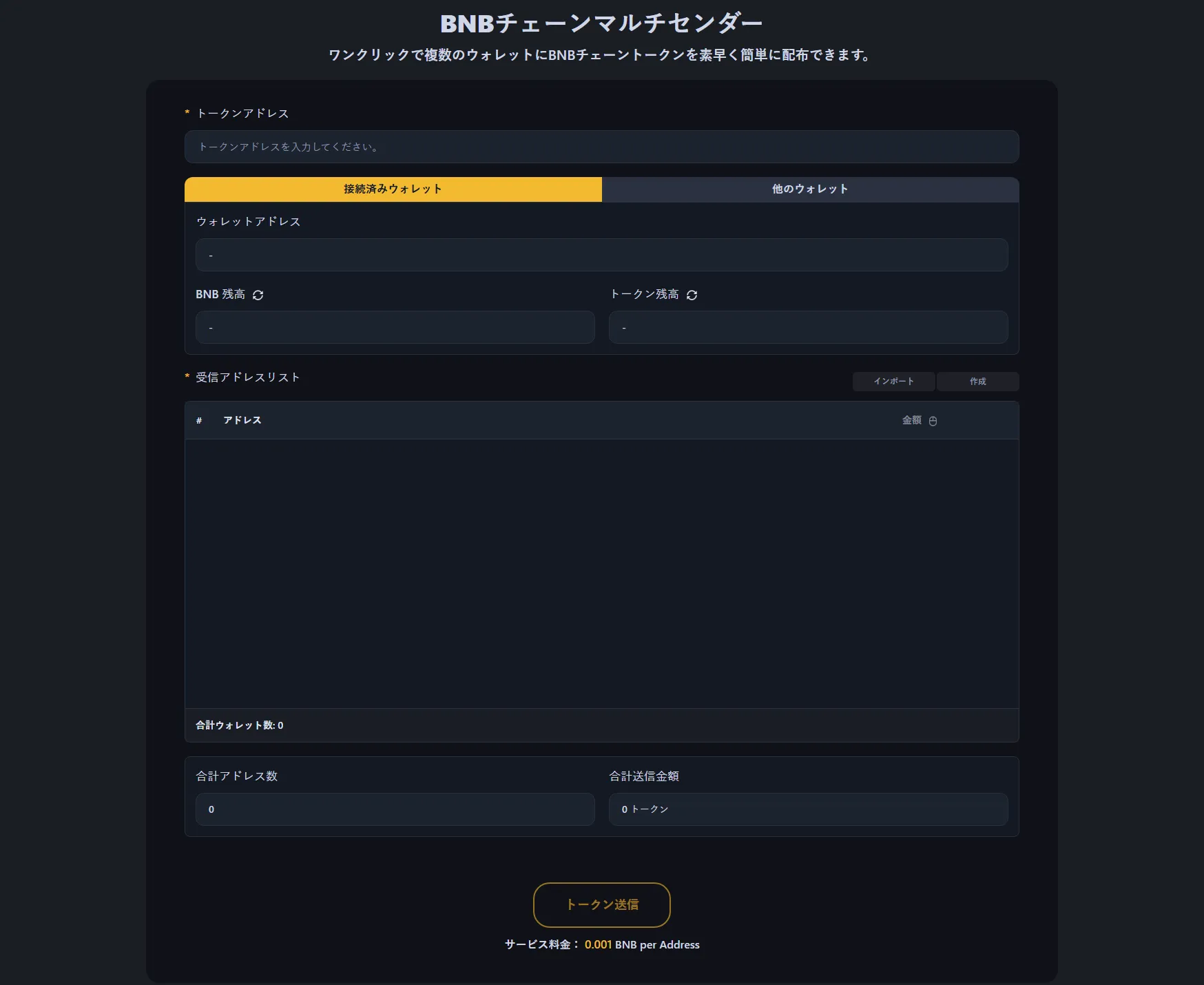 サービス料は受取アドレスあたり0.001 BNBです。例えば、100ウォレットにトークンを送信する場合、サービス料は0.1 BNBで、標準的なBNB Chainガス代が加算されます。