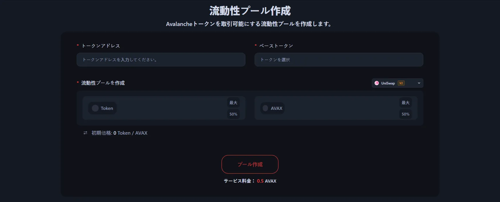 Alpheccaでの作成費用は0.5 AVAXで、ガス代は少額です。追加費用はありません。ただし、プールに預けるトークンとペアトークン(AVAX、USDTなど)は別途用意する必要があります。アバランチはガス代が安いため、コスト効率よく流動性プールを作成できます。