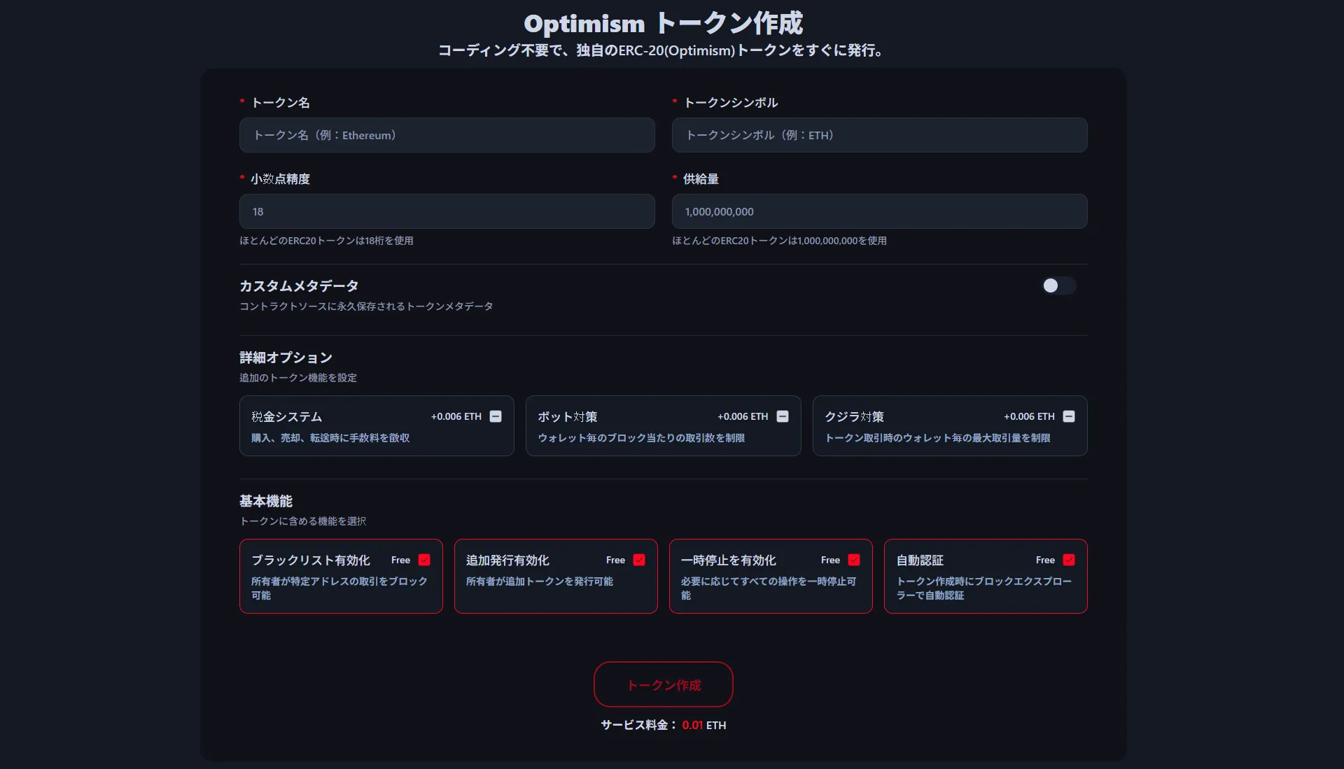 このdAppはイーサリアムのスケーラビリティ問題を解決するために設計されたOptimism(ERC-20)標準に完全準拠しており、低い手数料と高速な処理速度が特徴です。単純なトークン作成を超えて、プロジェクトの特性に合わせた詳細オプションを自由に設定できます。