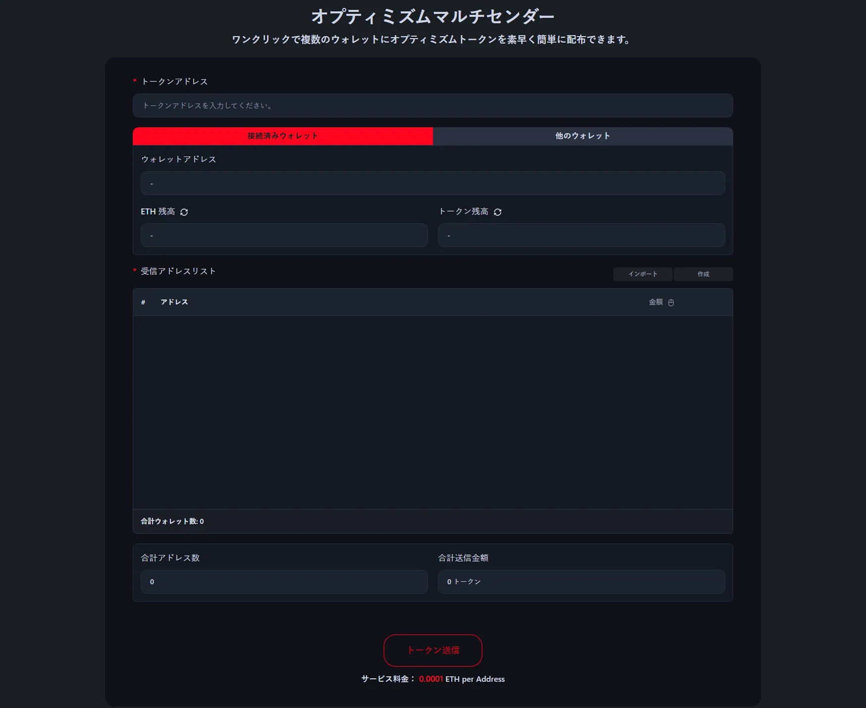 サービス料は受取アドレスあたり0.0001 ETHです。例えば、100ウォレットにトークンを送信する場合、サービス料は0.01 ETHで、標準的なOptimismガス代が加算されます。