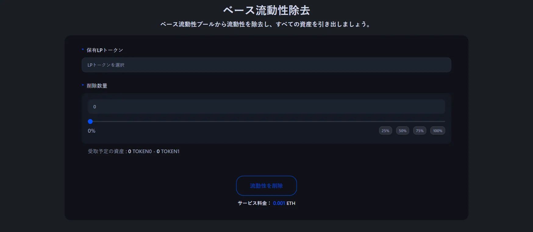 - 削除する流動性の割合を選択します:25%、50%、75%、または100%を引き出せます。