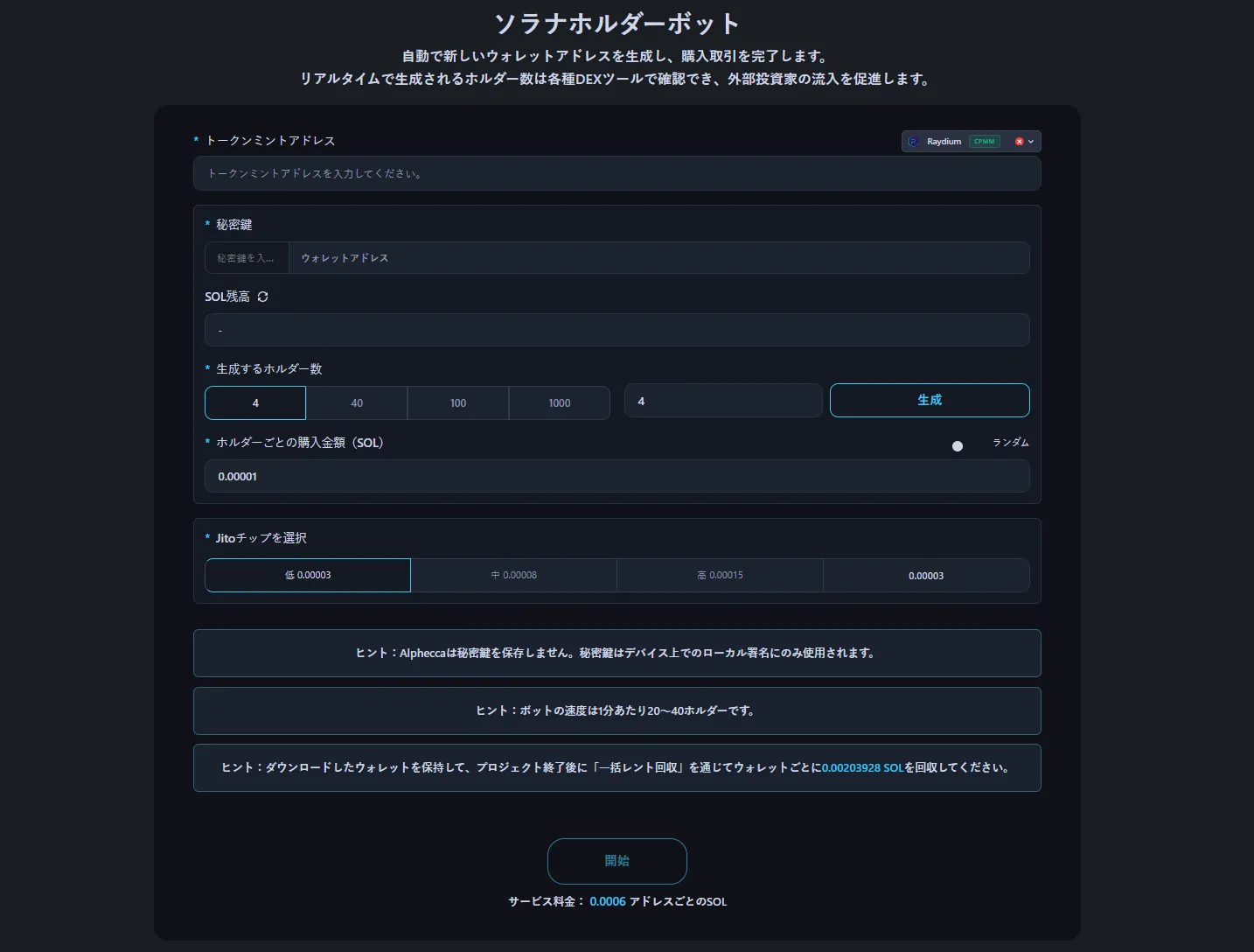 Alphecca ToolsのSolanaホルダーボットはホルダー生成を自動化します。新しいウォレットを作成し、各ウォレットからトークンを購入し、トークンはそのウォレットに残ります — オンチェーンホルダー数を直接増やします。