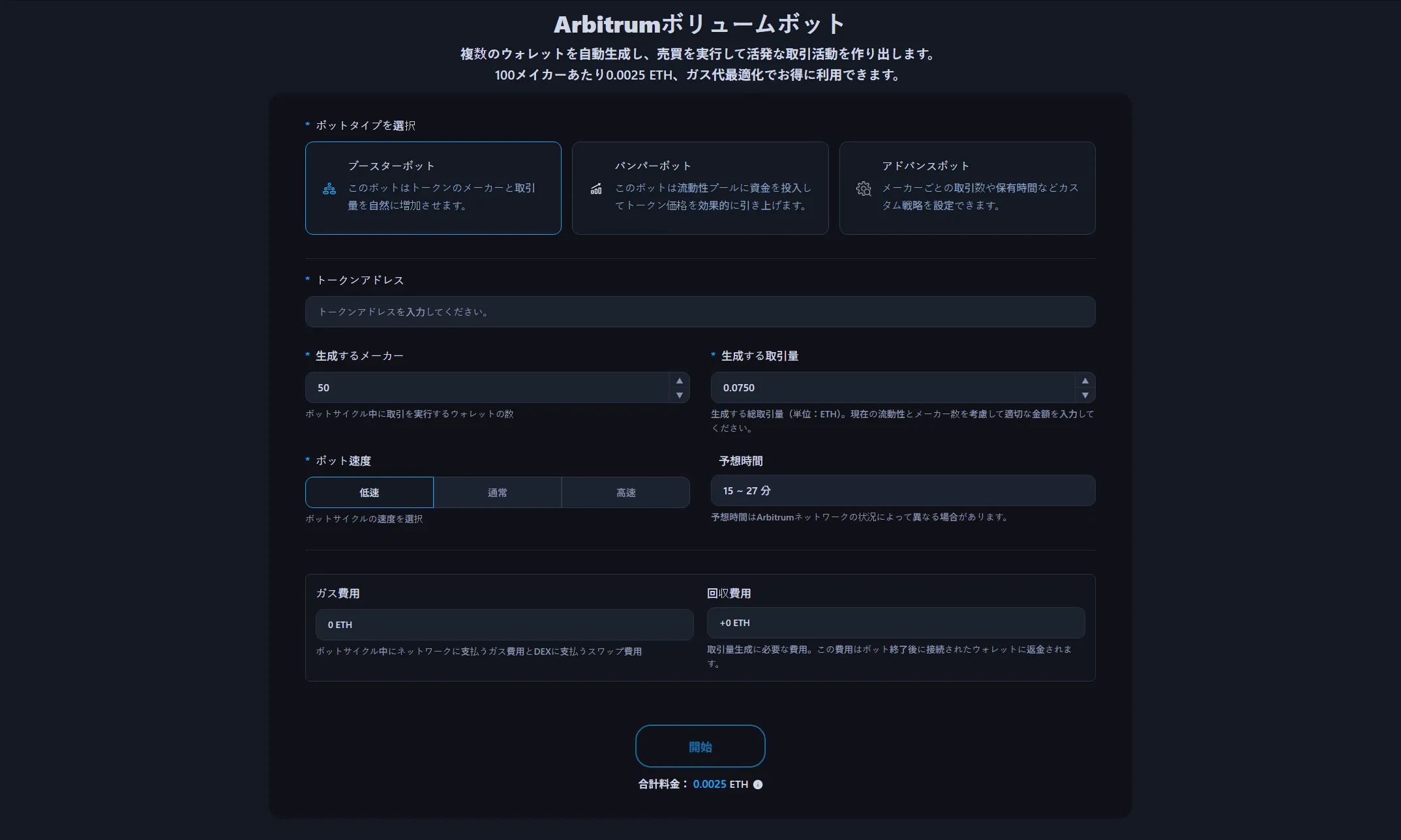 Arbitrum ボリュームボットの詳細なチュートリアルはArbitrum ボリュームボットガイドページで確認できます。