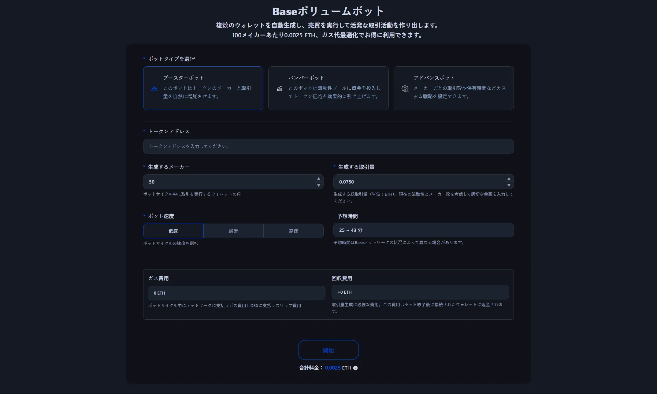100メイカーあたり0.0025 ETHで利用でき、取引量による追加費用はありません。ガス代とDEXスワップ手数料はボット開始前に計算・表示され、最適化された金額で実行されます。ボット完了後に返金されるETHも事前に確認できます。