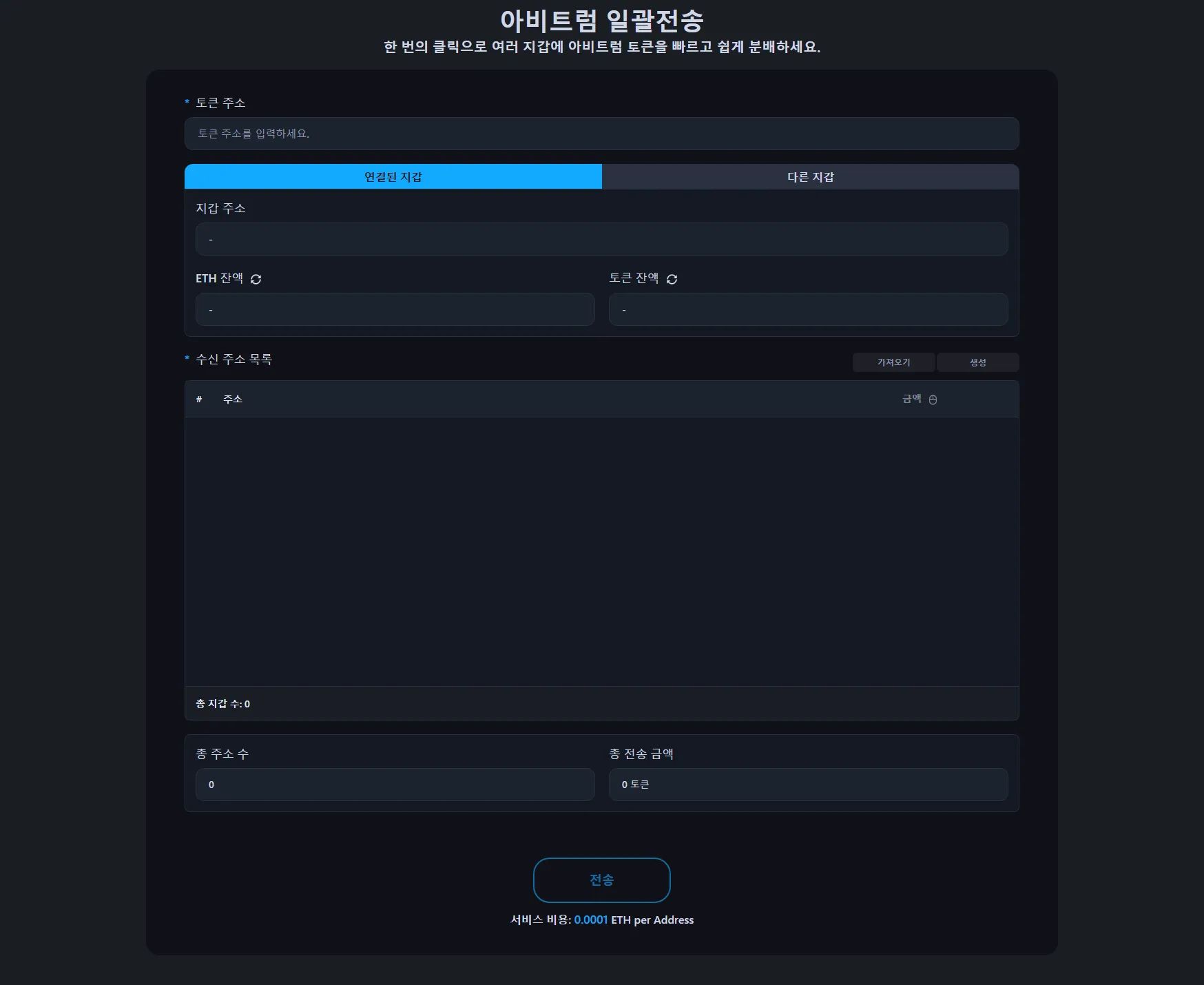 서비스 비용은 수신 주소당 0.0001 ETH입니다. 예를 들어 100개 지갑에 토큰을 보내면 서비스 비용은 0.01 ETH이며, 여기에 표준 Arbitrum 가스비가 추가됩니다.