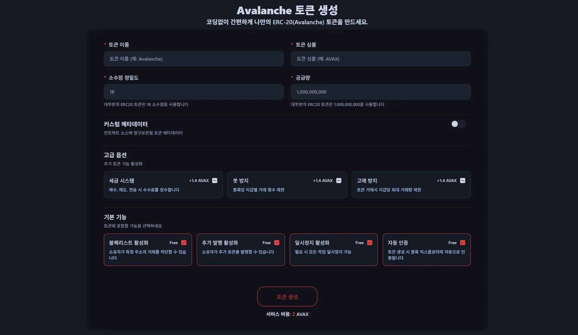 이 dApp은 이더리움의 확장성 문제를 해결하기 위해 설계된 아발란체 (ERC-20) 표준을 완벽하게 준수하며, 저렴한 수수료와 빠른 처리 속도가 특징입니다. 단순한 토큰 생성을 넘어, 프로젝트 특성에 맞게 세부 옵션을 자유롭게 구성할 수 있습니다.