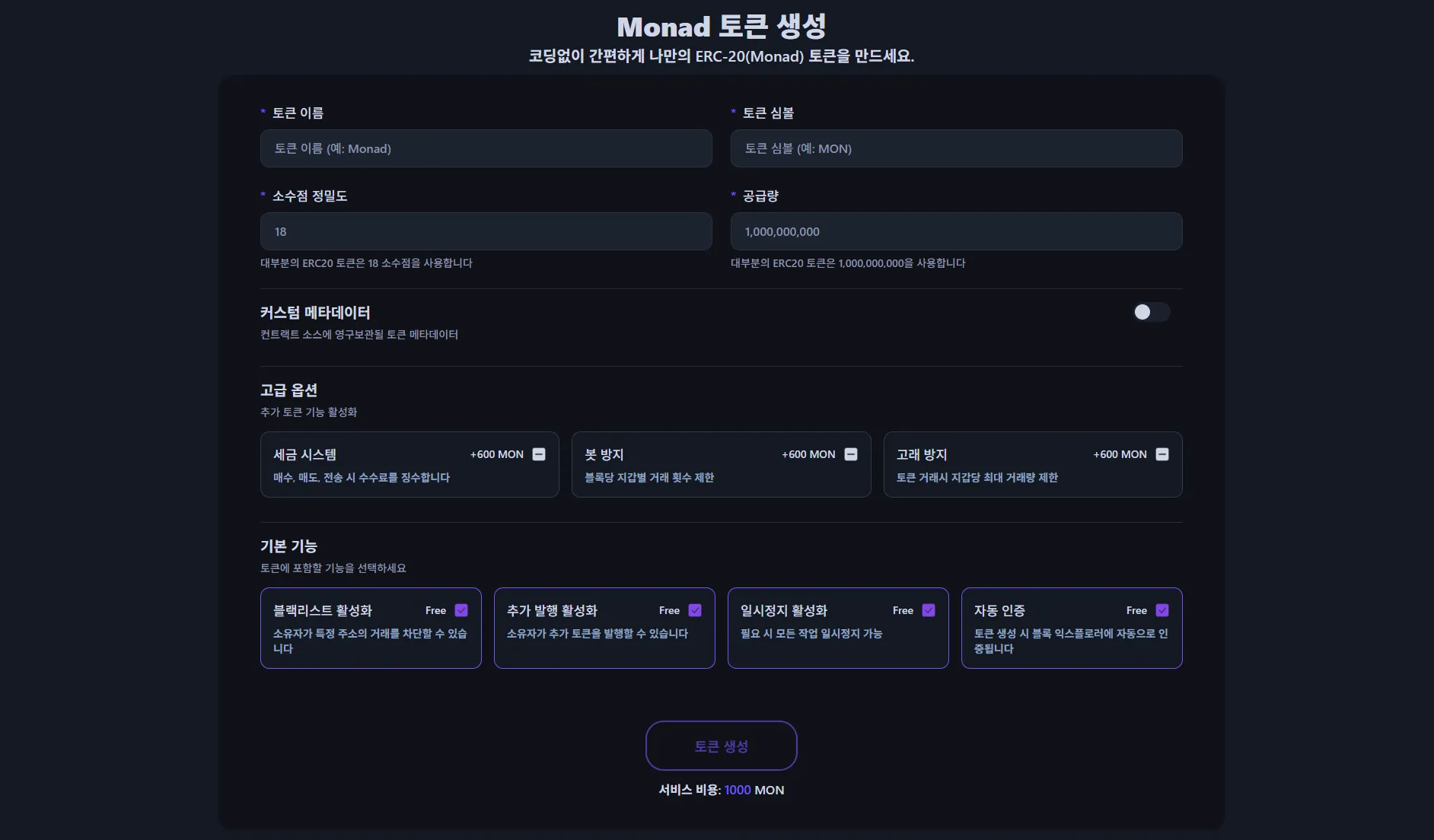 이 dApp은 초고속 처리 속도와 병렬 실행을 자랑하는 모나드(ERC-20) 표준을 완벽히 준수합니다. 단순한 토큰 생성뿐만 아니라, 프로젝트의 성격에 맞춰 세부적인 옵션을 자유롭게 설정할 수 있다는 것이 특징입니다.