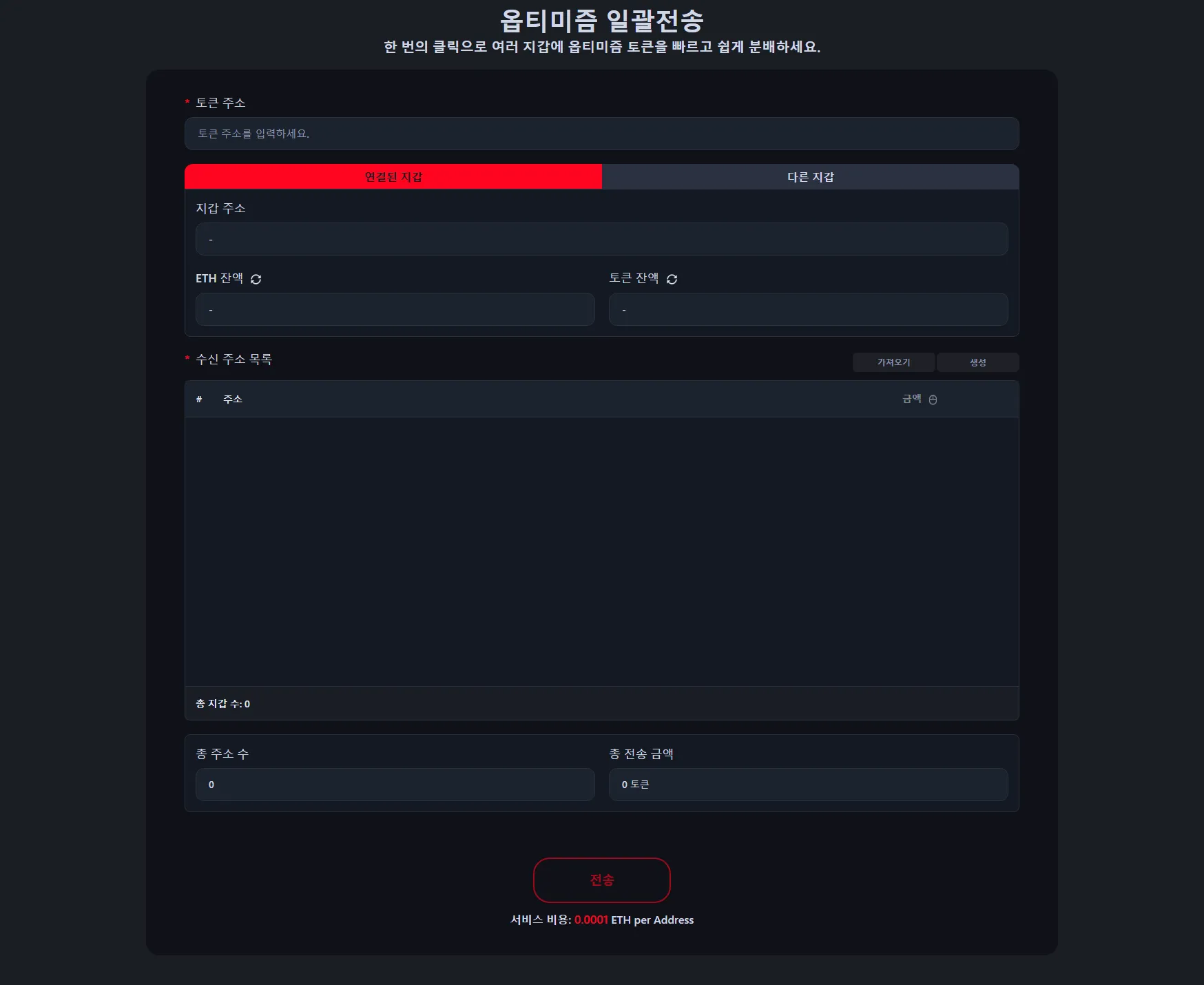 서비스 비용은 수신 주소당 0.0001 ETH입니다. 예를 들어 100개 지갑에 토큰을 보내면 서비스 비용은 0.01 ETH이며, 여기에 표준 Optimism 가스비가 추가됩니다.
