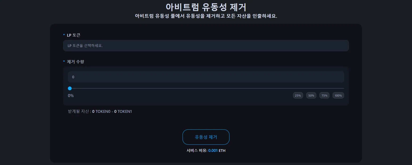 - 제거할 유동성 비율을 선택합니다: 25%, 50%, 75%, 또는 100%를 인출할 수 있습니다.