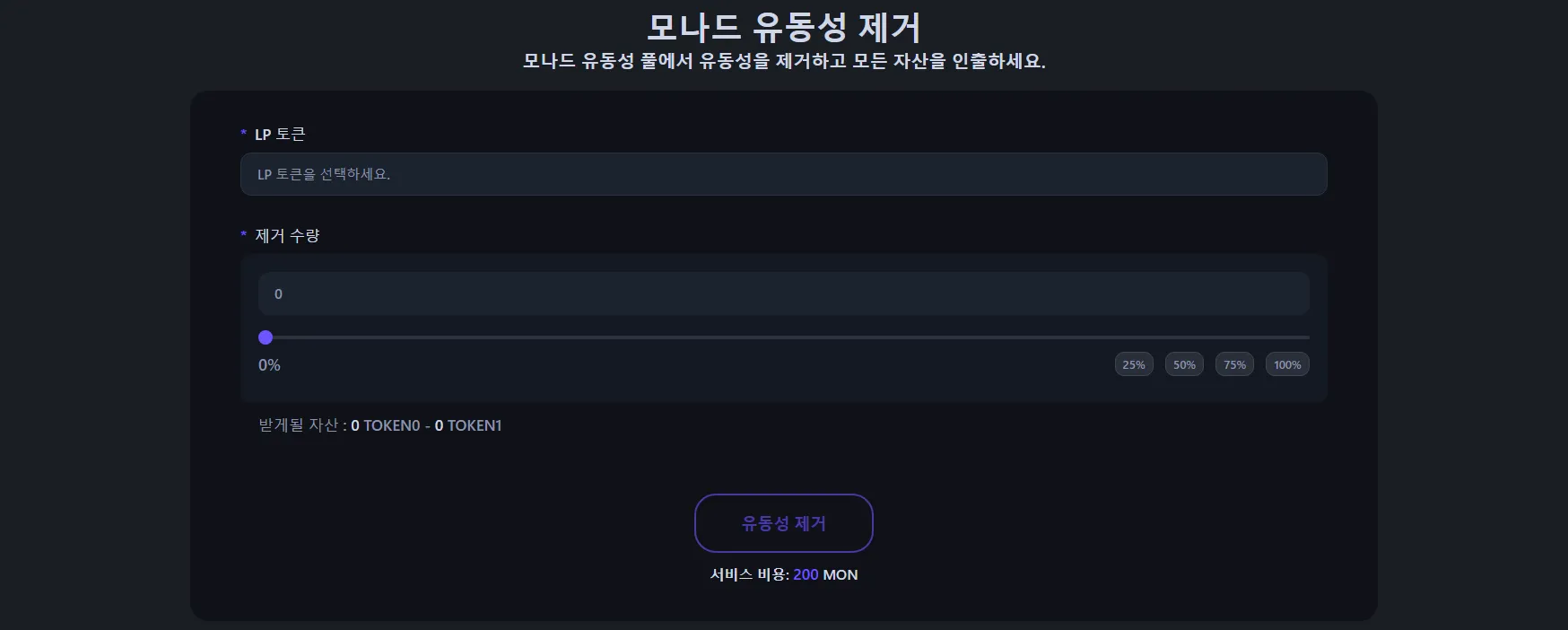 Monad 토큰 풀에서 유동성을 제거하려면 Monad 유동성 제거 도구로 이동하고 LP 토큰 또는 NFT 포지션이 있는 지갑을 연결합니다.