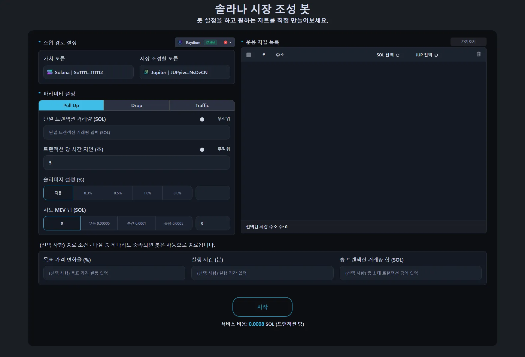 - 목표 가격 변동. 퍼센트 목표를 설정하세요 — Pull Up 모드에서 30을 입력하면, 가격이 시작점에서 30% 상승하면 봇이 멈춥니다. 과도한 매수를 방지하고 Traffic 모드로 전환하여 횡보할 수 있게 합니다.