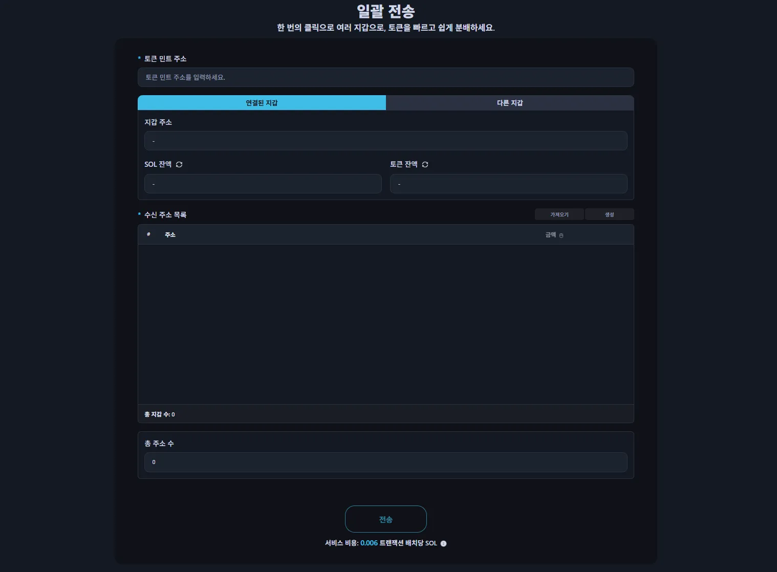 SOL과 모든 SPL 토큰을 지원합니다. 토큰의 민트 주소를 입력하면 도구가 자동으로 토큰을 로드합니다.