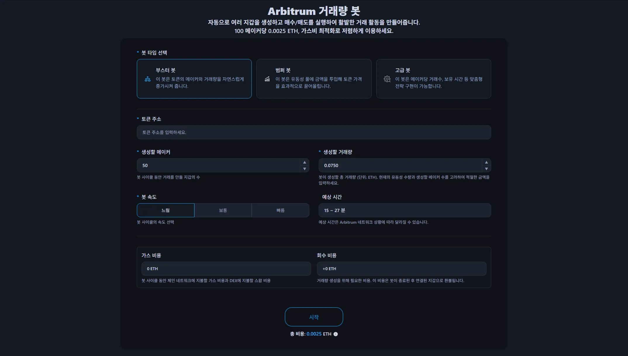 100 메이커당 0.0025 ETH로 이용할 수 있으며, 거래량에 따른 추가 비용은 없습니다. 가스비와 DEX 스왑 수수료는 봇 시작 전 미리 계산되어 표시되며, 최적화된 금액으로 실행됩니다. 봇 종료 후 돌려받을 ETH도 사전에 확인할 수 있습니다.