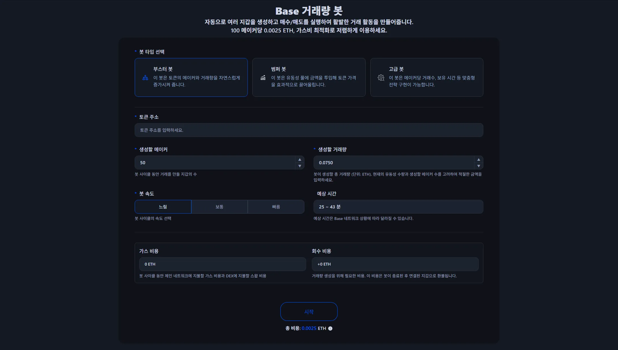100 메이커당 0.0025 ETH로 이용할 수 있으며, 거래량에 따른 추가 비용은 없습니다. 가스비와 DEX 스왑 수수료는 봇 시작 전 미리 계산되어 표시되며, 최적화된 금액으로 실행됩니다. 봇 종료 후 돌려받을 ETH도 사전에 확인할 수 있습니다.