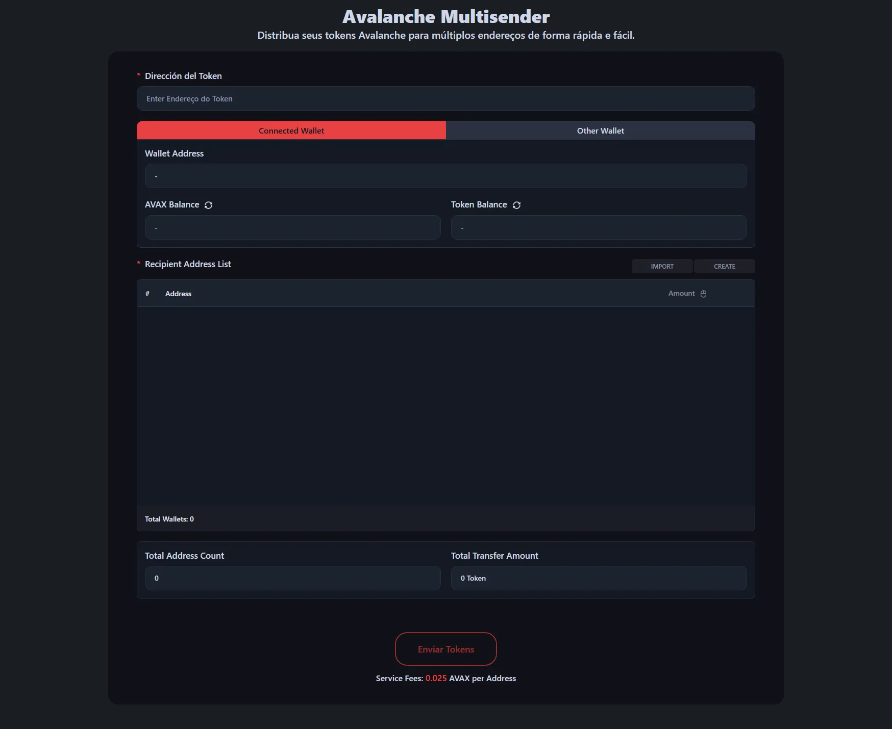 A taxa de serviço é de 0,0001 ETH por endereço de destinatário. Por exemplo, se enviar tokens para 100 carteiras, a taxa de serviço seria 0,01 ETH, mais a taxa de gas padrão do Avalanche.