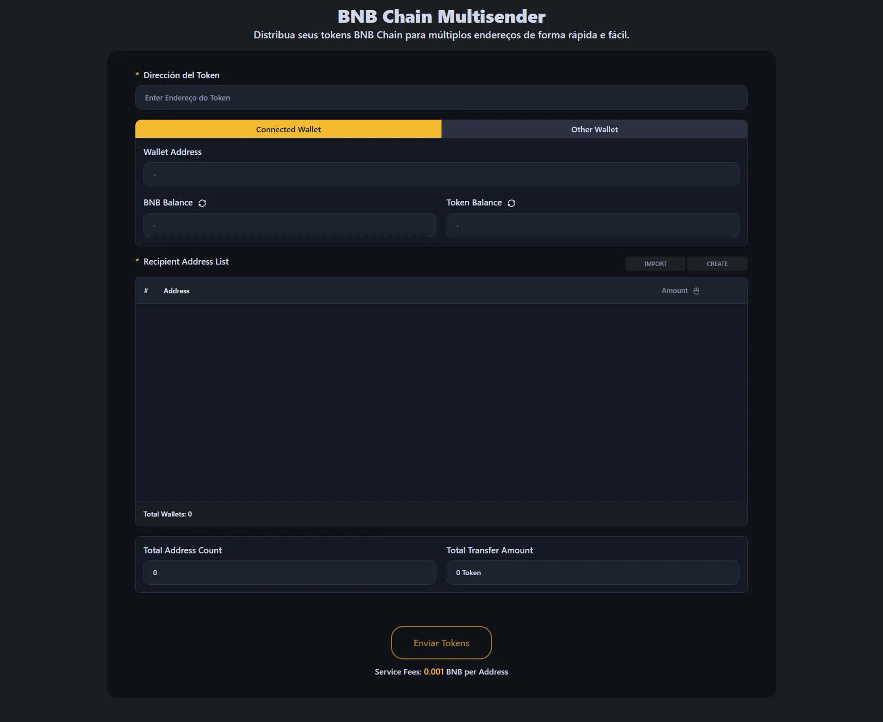A taxa de serviço é de 0,0001 BNB por endereço de destinatário. Por exemplo, se enviar tokens para 100 carteiras, a taxa de serviço seria 0,01 ETH, mais a taxa de gas padrão do BNB Chain.