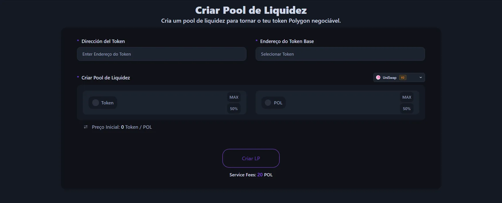 Com a Alphecca, a taxa de serviço é de 20 POL, e as taxas de gas são mínimas. Não há custos adicionais. No entanto, precisará de fornecer os seus próprios tokens e tokens de emparelhamento (POL, USDT, etc.) para o pool. A Polygon tem taxas de gas muito baixas, tornando a criação de pools de liquidez económica.
