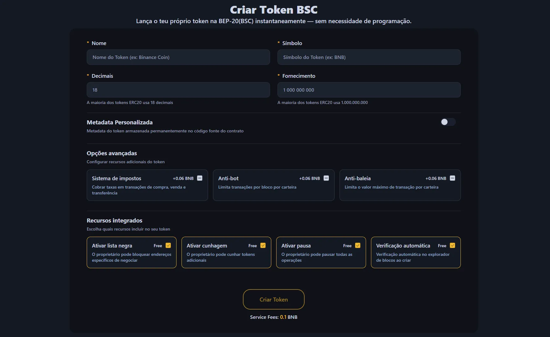 Esta dApp está em total conformidade com o padrão BNB Smart Chain (BEP20), conhecido pela sua velocidade de processamento rápida e taxas baixas com uma base de utilizadores sólida. Para além da simples criação de tokens, pode configurar livremente opções detalhadas para corresponder às características do seu projeto.