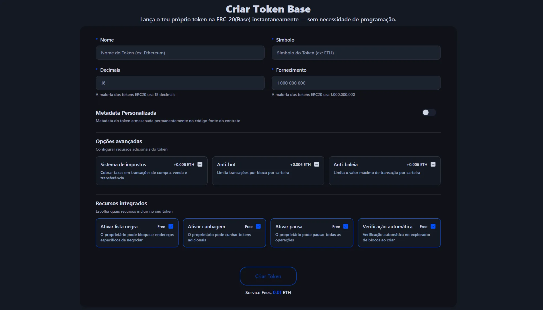 Esta dApp está em total conformidade com o padrão Base (ERC-20), uma solução Layer 2 do Ethereum desenvolvida pela Coinbase, conhecida por taxas baixas e velocidades de processamento rápidas. Além da simples criação de tokens, você pode configurar livremente opções detalhadas para corresponder às características do seu projeto.